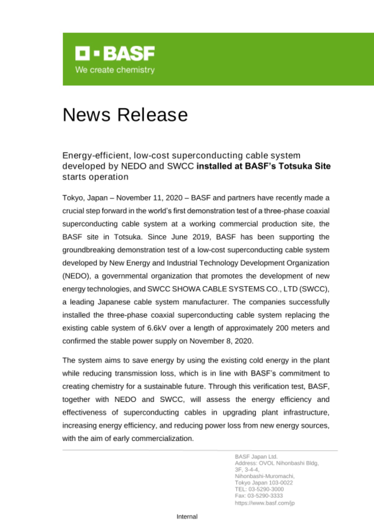 Tokyo, Japan – November 11, 2020 – BASF and partners have recently made a crucial step forward in the world’s first demonstration test of a three-phase coaxial superconducting cable system at a working commercial production site, the BASF site in Totsuka. Since June 2019, BASF has been supporting the groundbreaking demonstration test of a low-cost superconducting cable system developed by New Energy and Industrial Technology Development Organization (NEDO), a governmental organization that promotes the development of new energy technologies, and SWCC SHOWA CABLE SYSTEMS CO., LTD (SWCC), a leading Japanese cable system manufacturer. The companies successfully installed the three-phase coaxial superconducting cable system replacing the existing cable system of 6.6kV over a length of approximately 200 meters and confirmed the stable power supply on November 8, 2020.