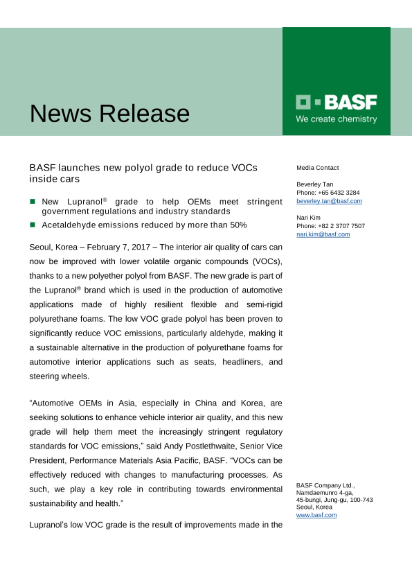 Seoul, Korea – February 7, 2017 – The interior air quality of cars can now be improved with lower volatile organic compounds (VOCs), thanks to a new polyether polyol from BASF. The new grade is part of the Lupranol® brand which is used in the production of automotive applications made of highly resilient flexible and semi-rigid polyurethane foams. The low VOC grade polyol has been proven to significantly reduce VOC emissions, particularly aldehyde, making it a sustainable alternative in the production of polyurethane foams for automotive interior applications such as seats, headliners, and steering wheels.