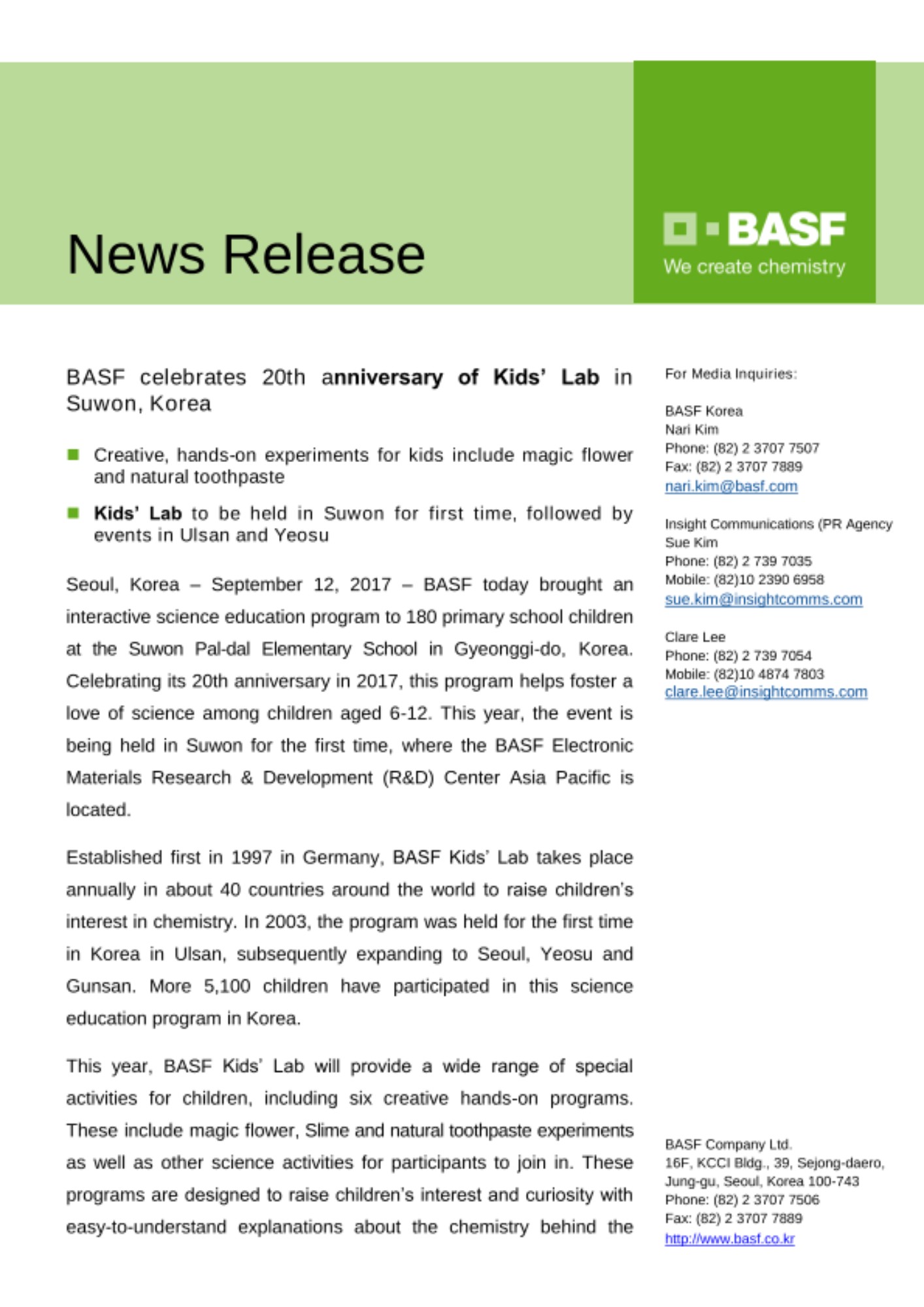 BASF focuses its corporate citizenship activities in Korea on quality education, in support of the fourth United Nations Strategic Development Goal. “BASF has been at the forefront of promoting the importance of science education to children all over the world. In Korea, we are celebrating the global 20th anniversary of Kids’ Lab by introducing the events for the first time to Suwon, where BASF's R&D center is located,” said WooSung Shin, Managing Director, BASF Korea.