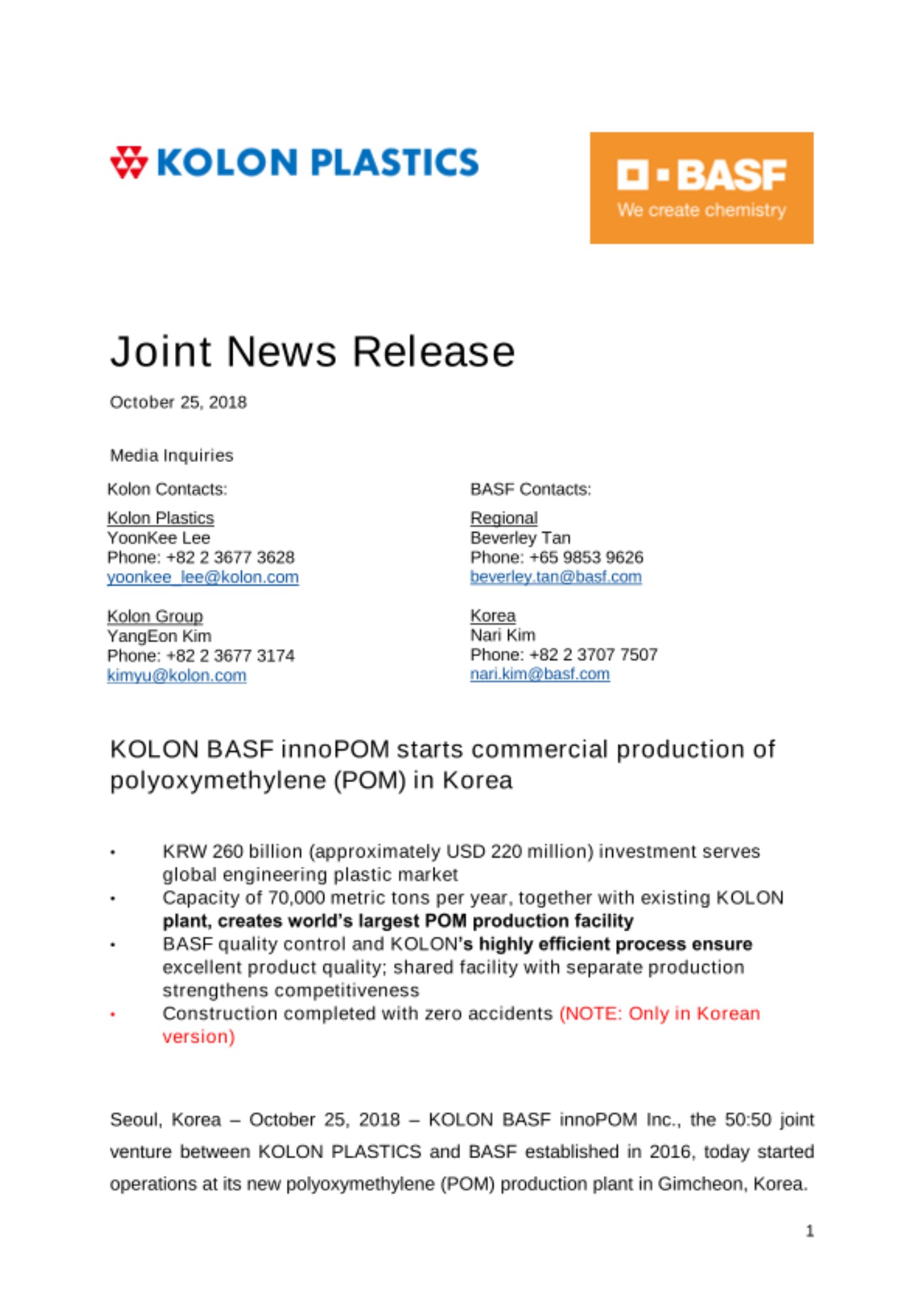 “The new plant we have built together with KOLON PLASTICS sets an industry benchmark for the production of POM. It employs innovative environmental management standards that improve production efficiency, resulting in less energy use. With BASF’s first POM production in Asia, we will be able to provide a stable supply of high-quality POM to the Asia Pacific region, as well as to the rest of the world,” said Raimar Jahn, President, Performance Materials, BASF.