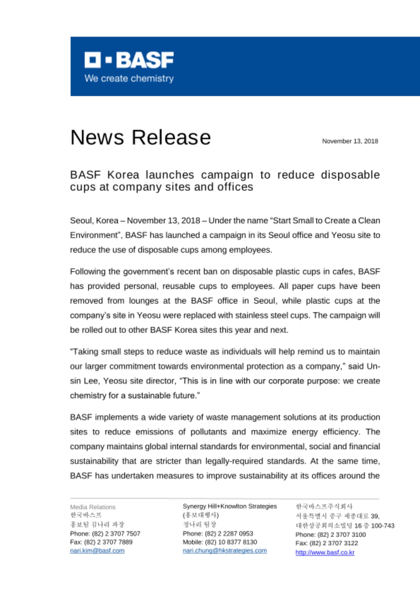 Seoul, Korea – November 12, 2018 – Under the name “Start Small to Create a Clean Environment”, BASF has launched a campaign in its Seoul office and Yeosu site to reduce the use of disposable cups among employees.