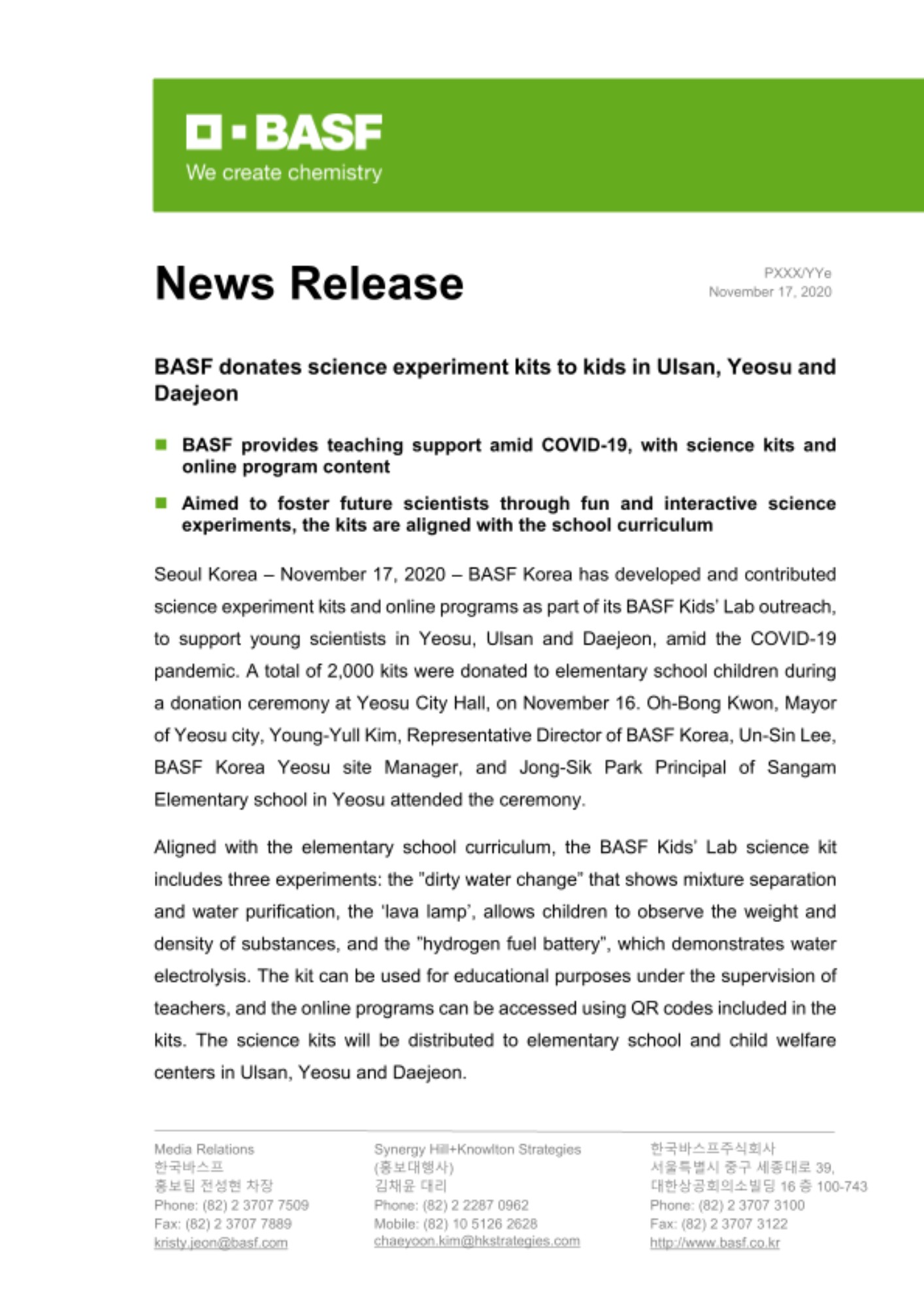 As a key part of BASF’s social engagement activities focus on science education, BASF Kids’ Lab was first established in 1997 in Germany. It takes place annually in more than 30 countries around the world, with the aim to raise children’s interest in chemistry. This year, BASF Korea has developed science experiment kits and online programs to bring a safe, contactless educational experience for the children, as opposed to the physical events held across the country in the past. This initiative is in addition to the ‘Virtual Kids’ Lab’ which was launched in Korea in 2017 in celebration of the 20-year anniversary of BASF Kids’ Lab in Korea.