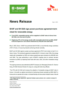 “The PPA with SK E&S will increase the adoption of renewable energy at BASF sites in Korea. In line with our global commitment of achieving climate neutrality by 2050, BASF in Korea aims to operate all its sites in climate-friendly and low carbon footprint basis. We will leverage renewable energy and advanced technologies to transform existing production processes and work towards achieving our climate neutrality goal.” said Dr. Dschun Song, Managing Director of BASF Company Ltd.
