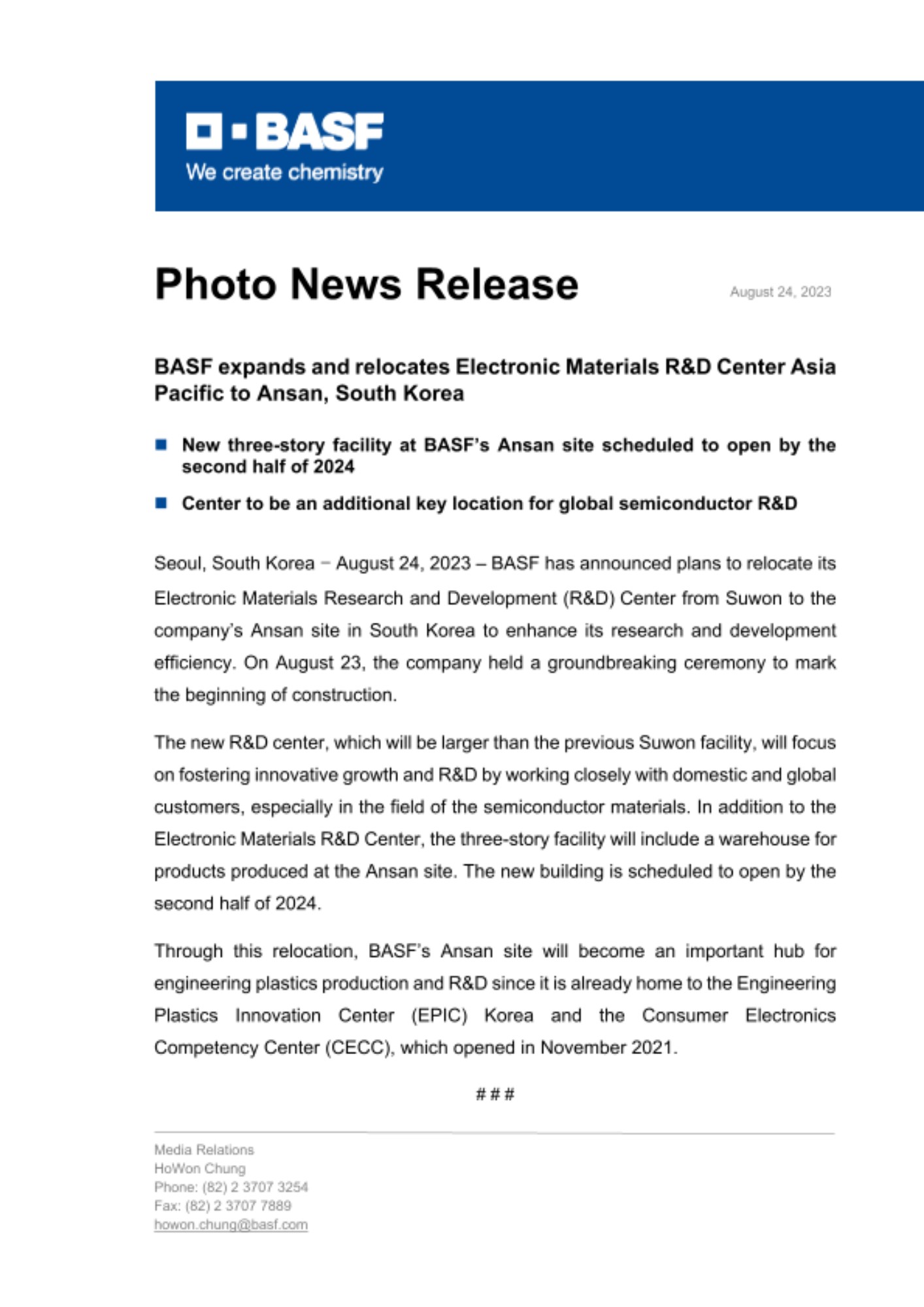 - New three-story facility at BASF’s Ansan site scheduled to open by the second half of 2024