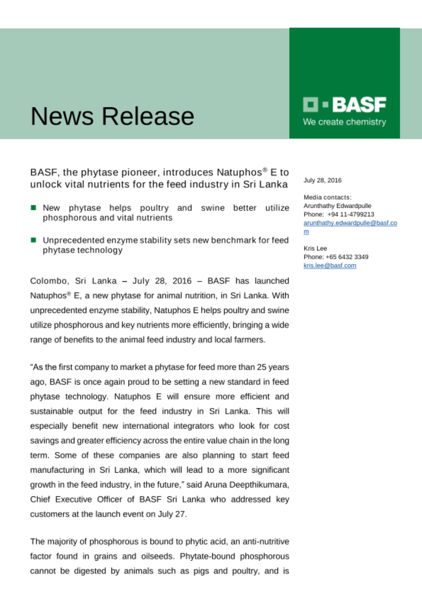 Colombo, Sri Lanka – July 28, 2016 – BASF has launched Natuphos® E, a new phytase for animal nutrition, in Sri Lanka. With unprecedented enzyme stability, Natuphos E helps poultry and swine utilize phosphorous and key nutrients more efficiently, bringing a wide range of benefits to the animal feed industry and local farmers.