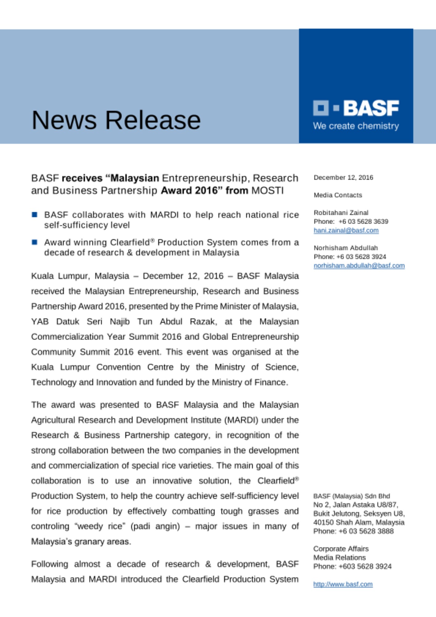 The award was presented to BASF Malaysia and the Malaysian Agricultural Research and Development Institute (MARDI) under the Research & Business Partnership category, in recognition of the strong collaboration between the two companies in the development and commercialization of special rice varieties. The main goal of this collaboration is to use an innovative solution, the Clearfield® Production System, to help the country achieve self-sufficiency level for rice production by effectively combatting tough grasses and controling “weedy rice” (padi angin) – major issues in many of Malaysia’s granary areas.