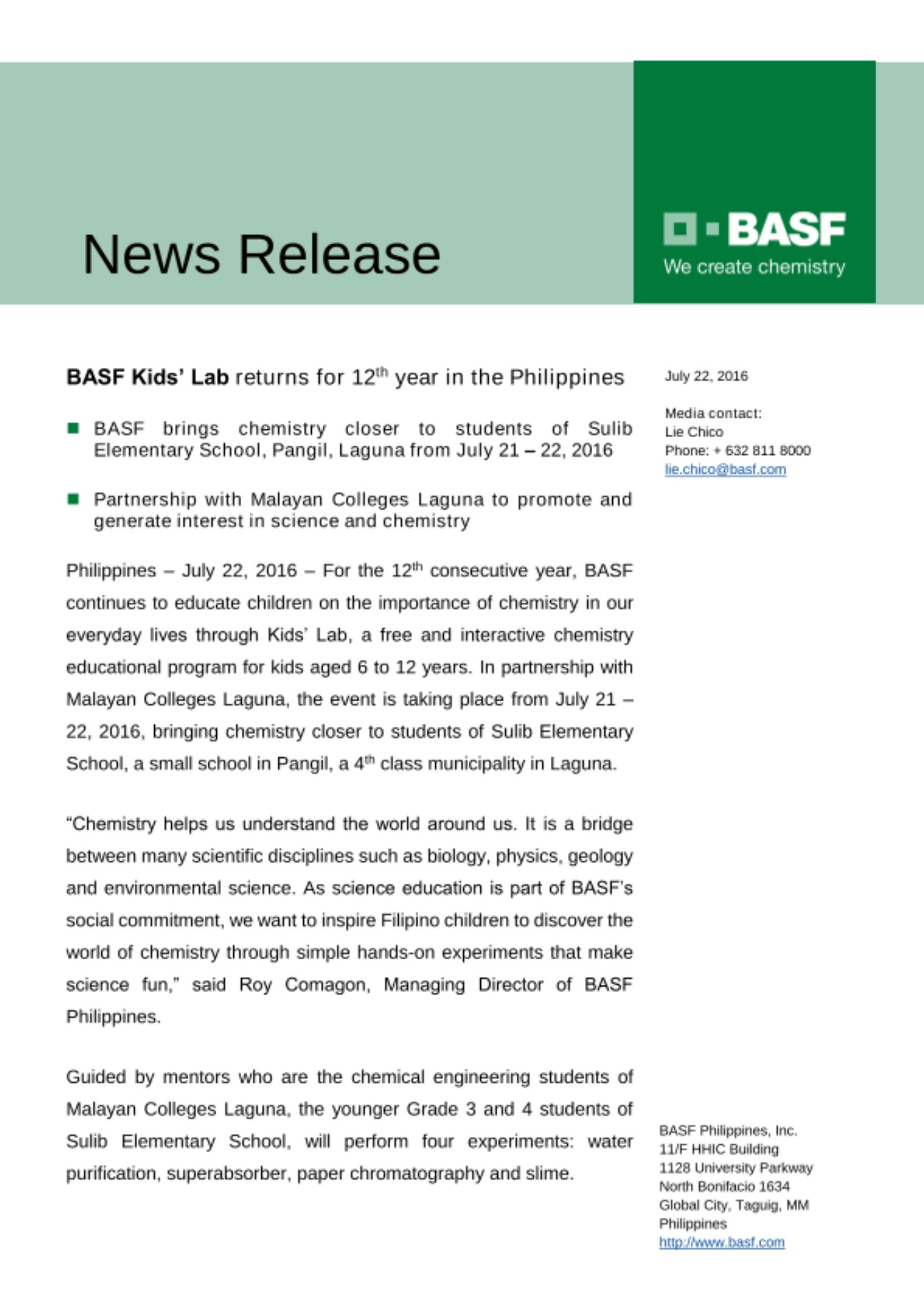 - BASF brings chemistry closer to students of Sulib Elementary School, Pangil, Laguna from July 21 – 22, 2016