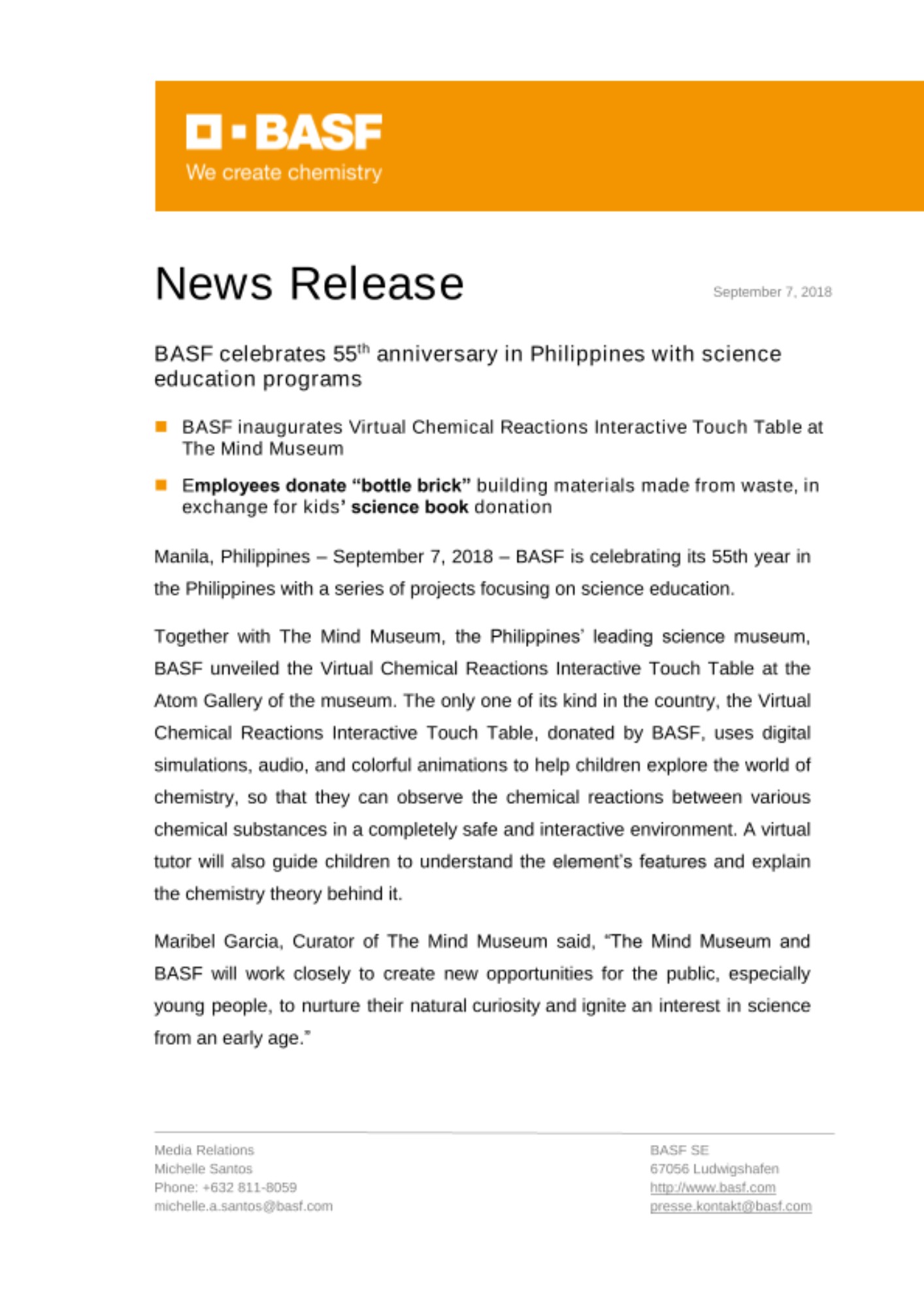 Manila, Philippines – September 7, 2018 – BASF is celebrating its 55th year in the Philippines with a series of projects focusing on science education.