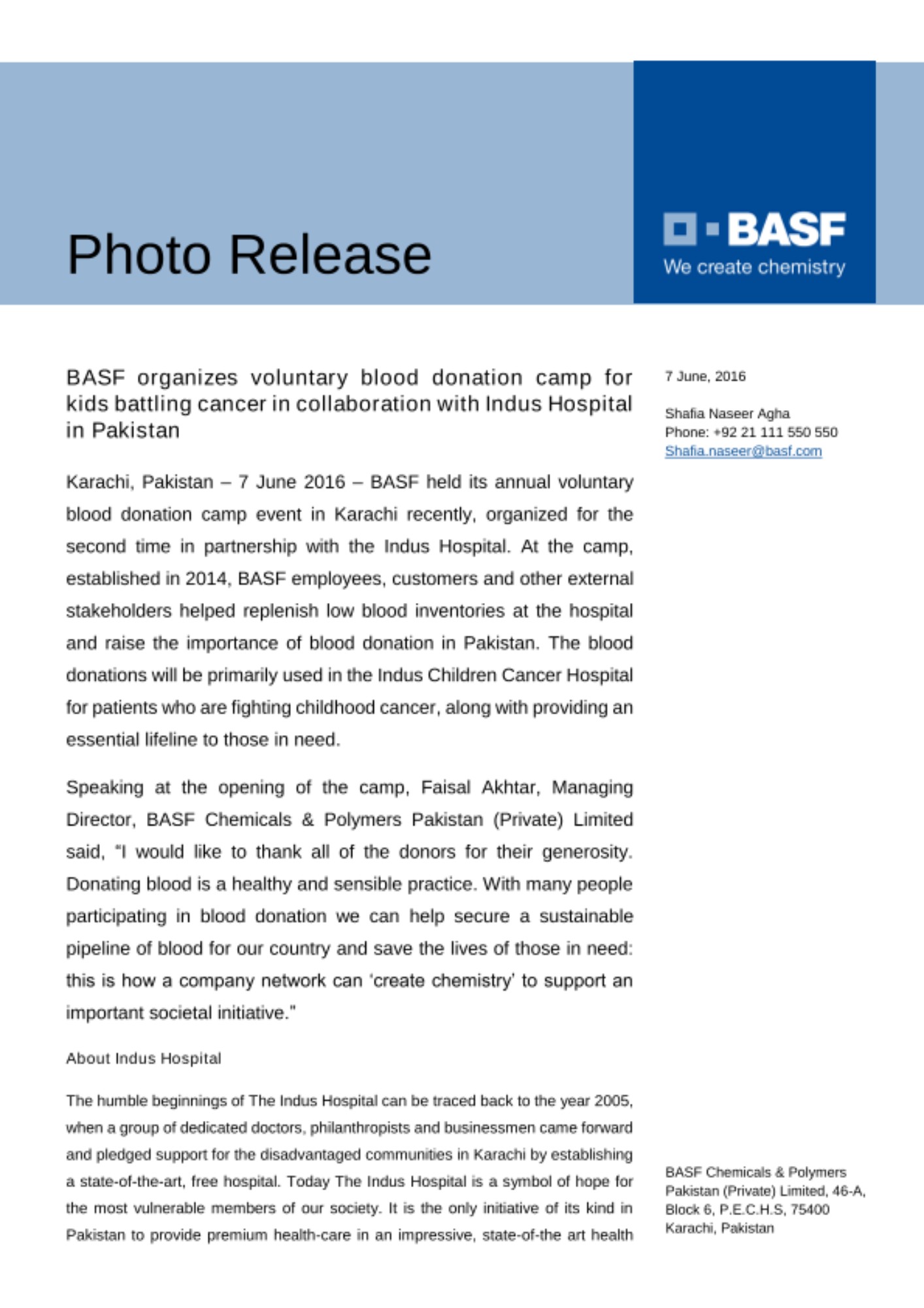 Karachi, Pakistan – 7 June 2016 – BASF held its annual voluntary blood donation camp event in Karachi recently, organized for the second time in partnership with the Indus Hospital. At the camp, established in 2014, BASF employees, customers and other external stakeholders helped replenish low blood inventories at the hospital and raise the importance of blood donation in Pakistan. The blood donations will be primarily used in the Indus Children Cancer Hospital for patients who are fighting childhood cancer, along with providing an essential lifeline to those in need.