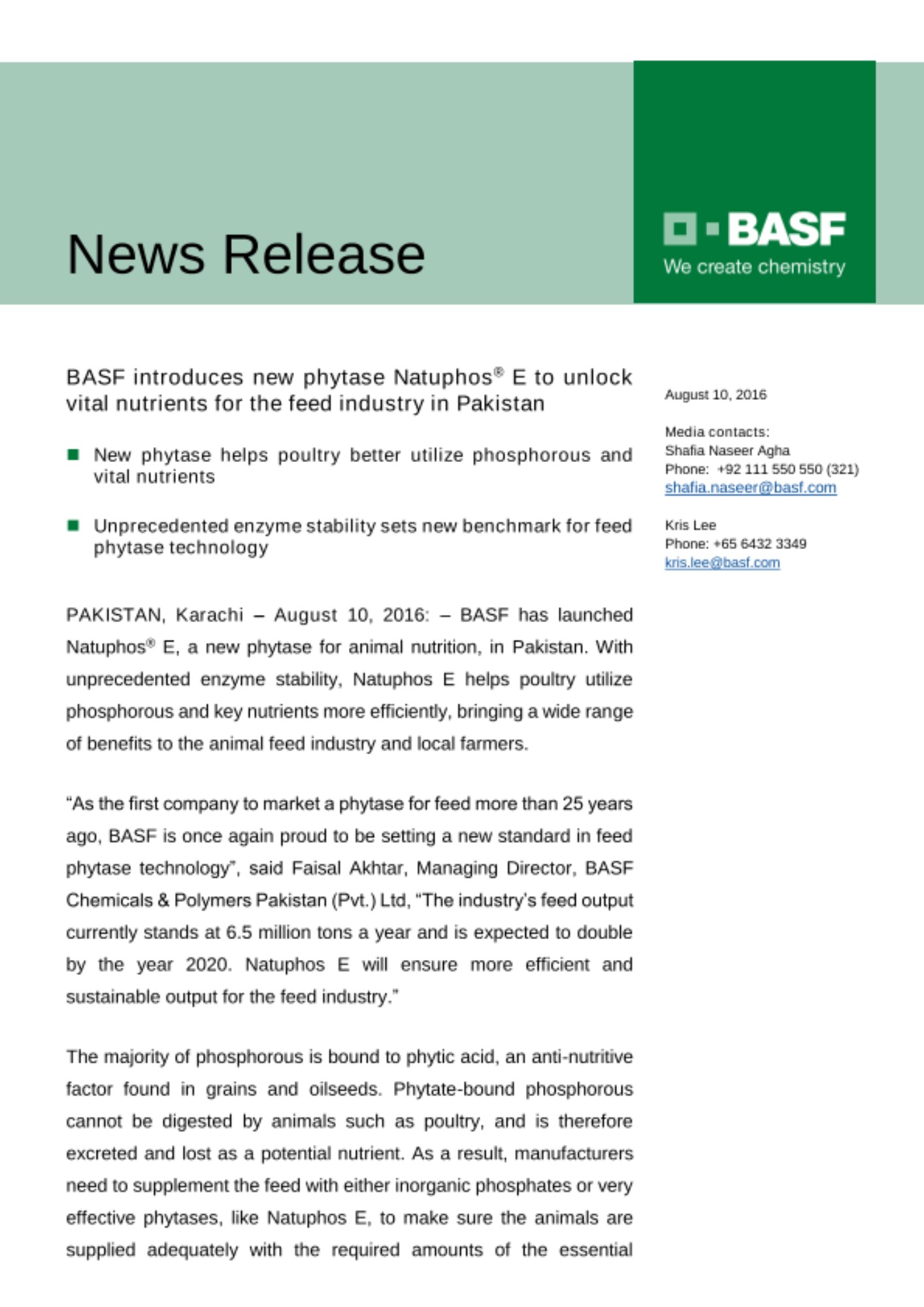 BASF introduces new phytase Natuphos® E to unlock vital nutrients for the feed industry in Pakistan