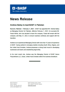 BASF has appointed Mr. Andrew Bailey as Managing Director for Pakistan, effective February 1, 2023. He succeeds Mr. Faisal Akhtar, who has decided to leave the company. Faisal will remain with the company until May 31, 2023, to ensure business continuity and support with the transition.