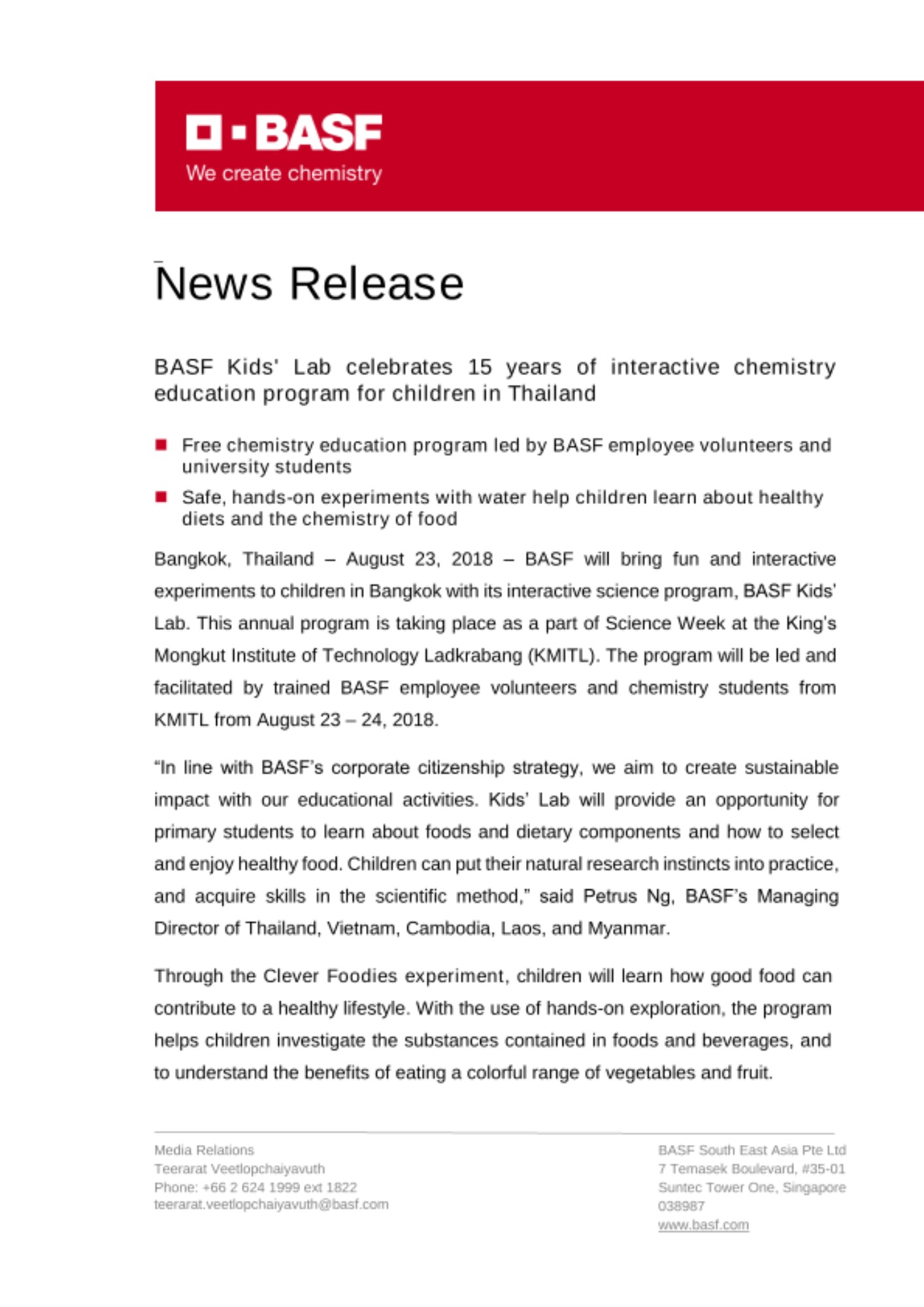 “In line with BASF’s corporate citizenship strategy, we aim to create sustainable impact with our educational activities. Kids’ Lab will provide an opportunity for primary students to learn about foods and dietary components and how to select and enjoy healthy food. Children can put their natural research instincts into practice, and acquire skills in the scientific method,” said Petrus Ng, BASF’s Managing Director of Thailand, Vietnam, Cambodia, Laos, and Myanmar.