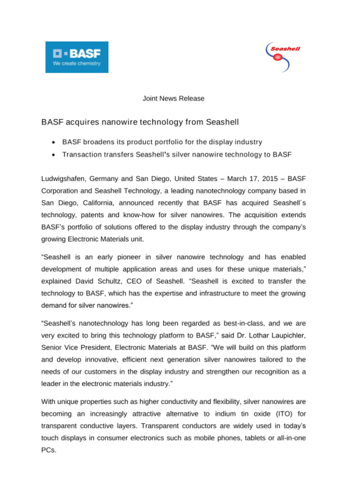 Ludwigshafen, Germany and San Diego, United States – March 17, 2015 – BASF Corporation and Seashell Technology, a leading nanotechnology company based in San Diego, California, announced recently that BASF has acquired Seashell´s technology, patents and know-how for silver nanowires. The acquisition extends BASF’s portfolio of solutions offered to the display industry through the company’s growing Electronic Materials unit.