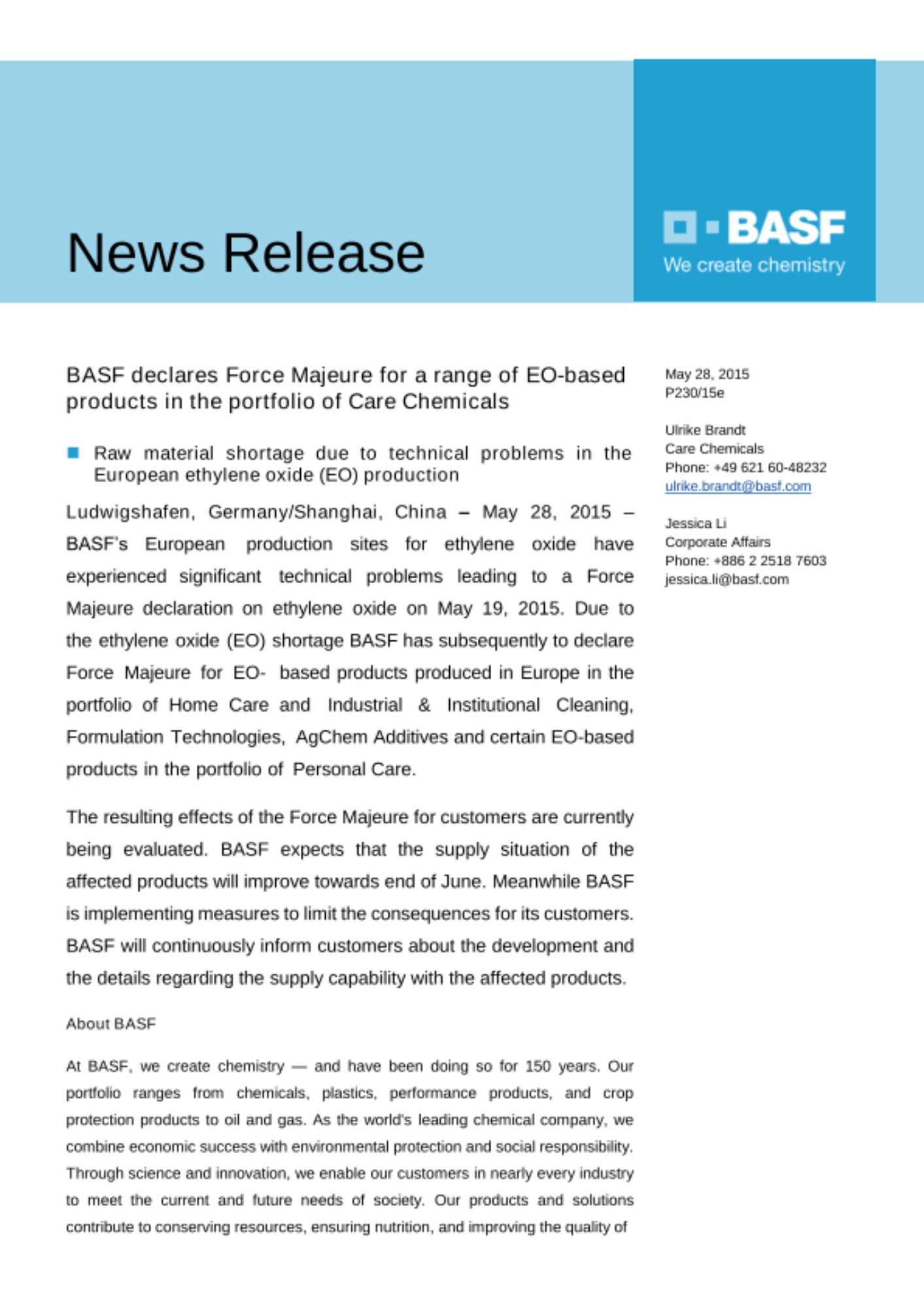 Ludwigshafen, Germany – May 28, 2015 – BASF’s European production sites for ethylene oxide have experienced significant technical problems leading to a Force Majeure declaration on ethylene oxide on May 19, 2015. Due to the ethylene oxide (EO) shortage BASF has subsequently to declare Force Majeure for EO-based products produced in Europe in the portfolio of Home Care and Industrial & Institutional Cleaning, Formulation Technologies, AgChem Additives and certain EO-based products in the portfolio of Personal Care.