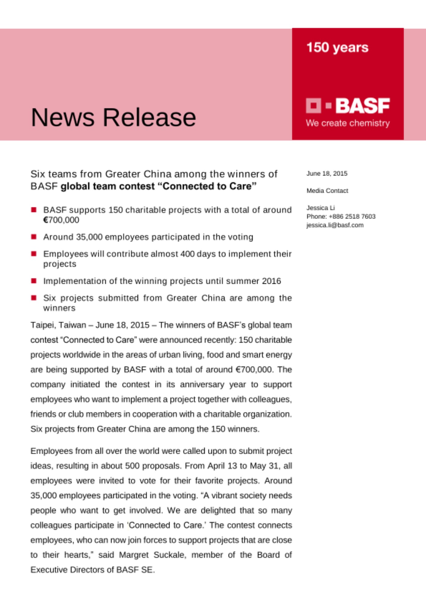 Taipei, Taiwan – June 18, 2015 – The winners of BASF’s global team contest “Connected to Care” were announced recently: 150 charitable projects worldwide in the areas of urban living, food and smart energy are being supported by BASF with a total of around €700,000. The company initiated the contest in its anniversary year to support employees who want to implement a project together with colleagues, friends or club members in cooperation with a charitable organization. Six projects from Greater China are among the 150 winners.