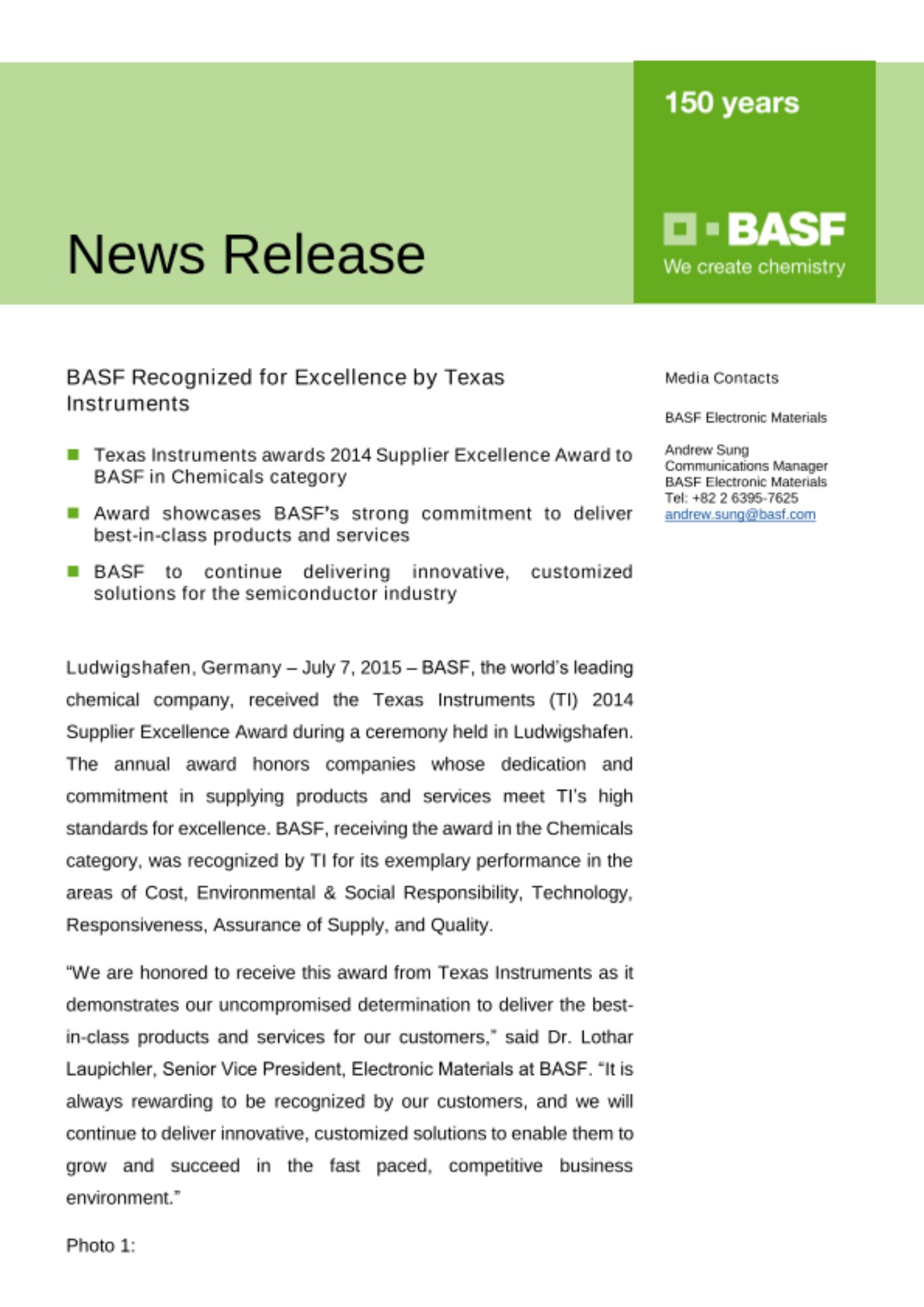 - Texas Instruments awards 2014 Supplier Excellence Award to BASF in Chemicals category