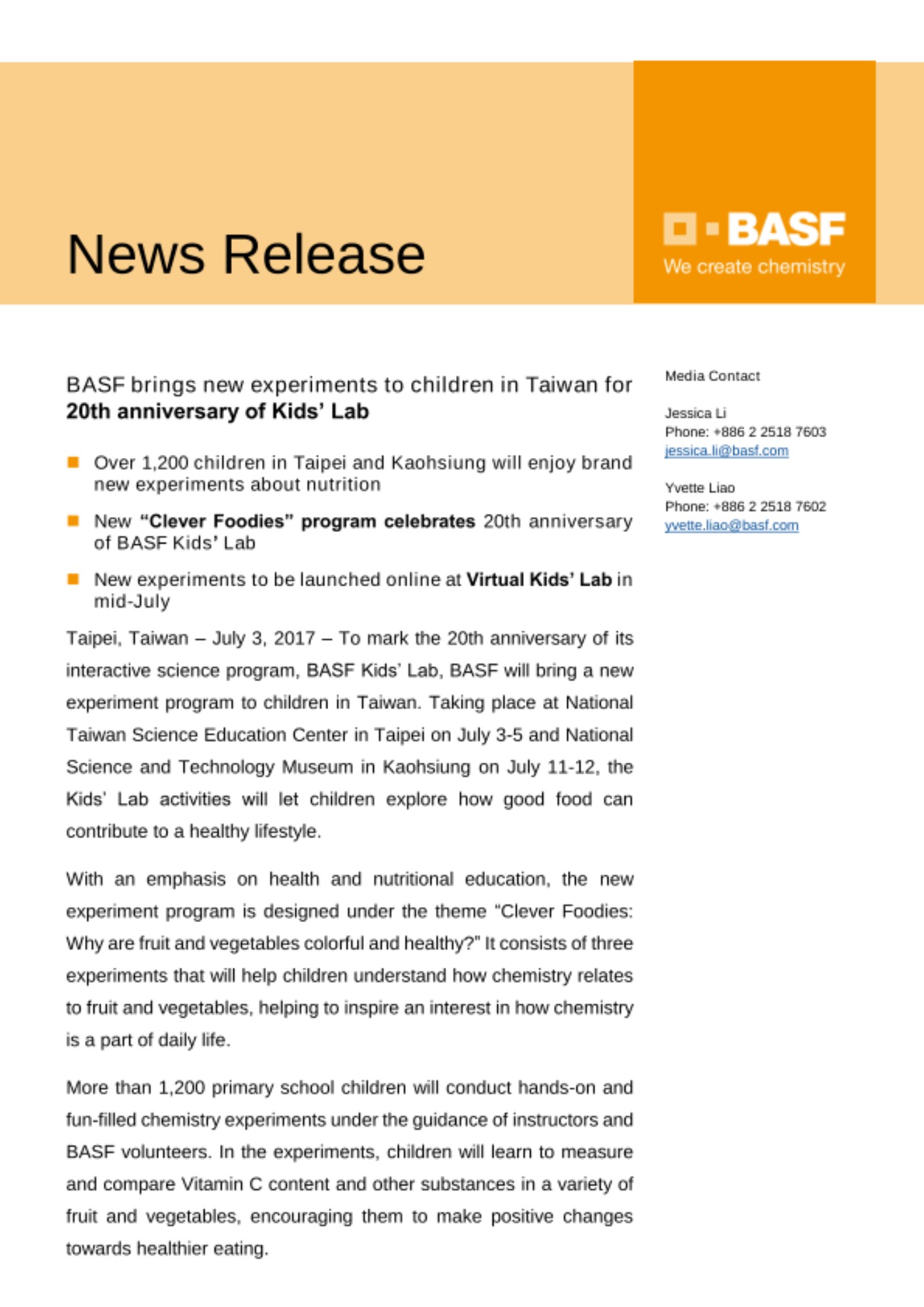 Taipei, Taiwan – July 3, 2017 – To mark the 20th anniversary of its interactive science program, BASF Kids’ Lab, BASF will bring a new experiment program to children in Taiwan. Taking place at National Taiwan Science Education Center in Taipei on July 3-5 and National Science and Technology Museum in Kaohsiung on July 11-12, the Kids’ Lab activities will let children explore how good food can contribute to a healthy lifestyle.