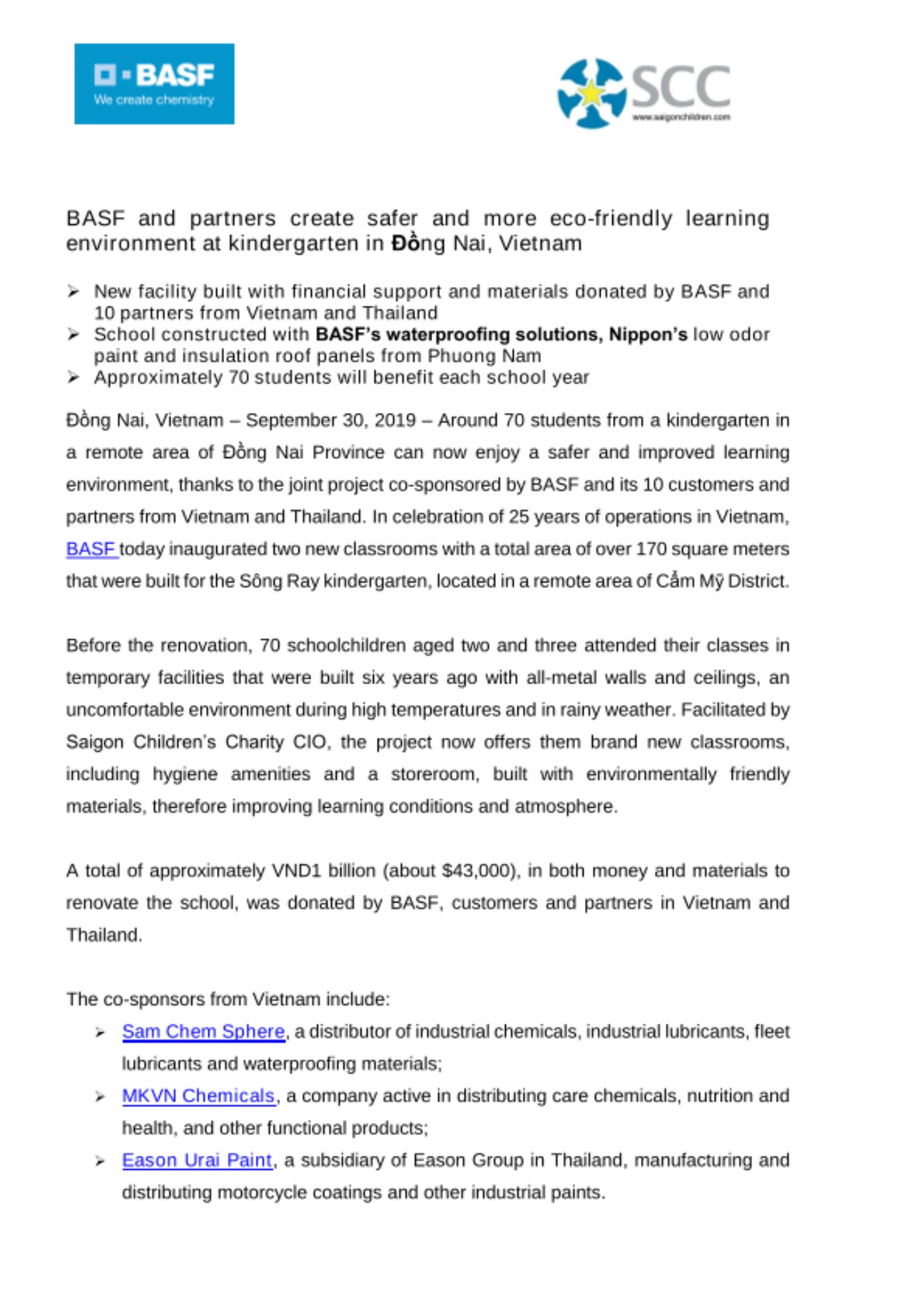 Erick Contreras, Managing Director, BASF Vietnam, said, “Vietnam is an important market for BASF and we are committed to long term investments focused on sustainability. This year marks our 25th anniversary in Vietnam and we want to celebrate it with something that could make an impact on the community. By providing a healthy learning environment for local children, we can ensure that they have better access to education and increase their chance for a successful future in both career and life. This contributes to our multiple efforts to support the development of Vietnam’s education.”