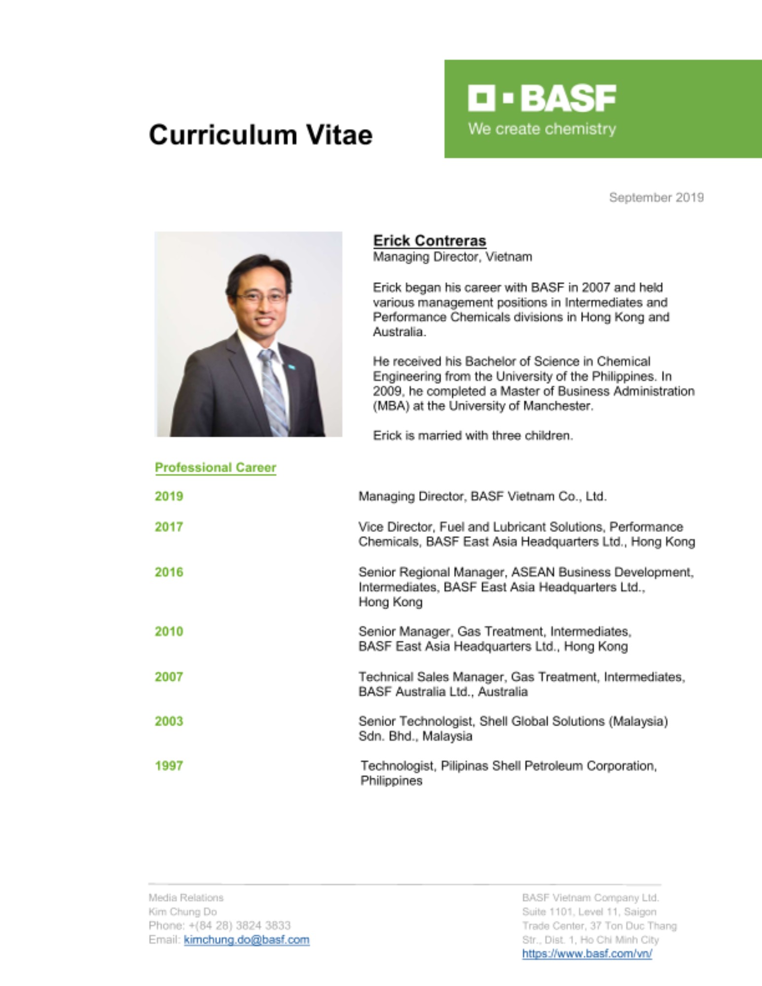 Contreras began his career with BASF in 2007 as a technical sales manager for the gas treatment business in Australia. He then moved to BASF Asia Pacific Regional Headquarters in Hong Kong in 2010 and held various management positions in the Intermediates and Performance Chemicals divisions.