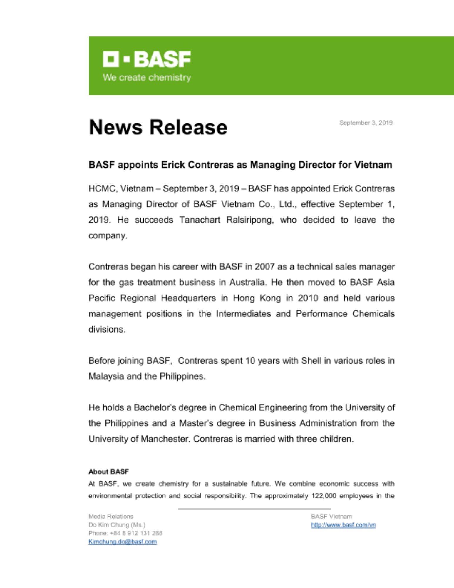 HCMC, Vietnam – September 3, 2019 – BASF has appointed Erick Contreras as Managing Director of BASF Vietnam Co., Ltd., effective September 1, 2019. He succeeds Tanachart Ralsiripong, who decided to leave the company.