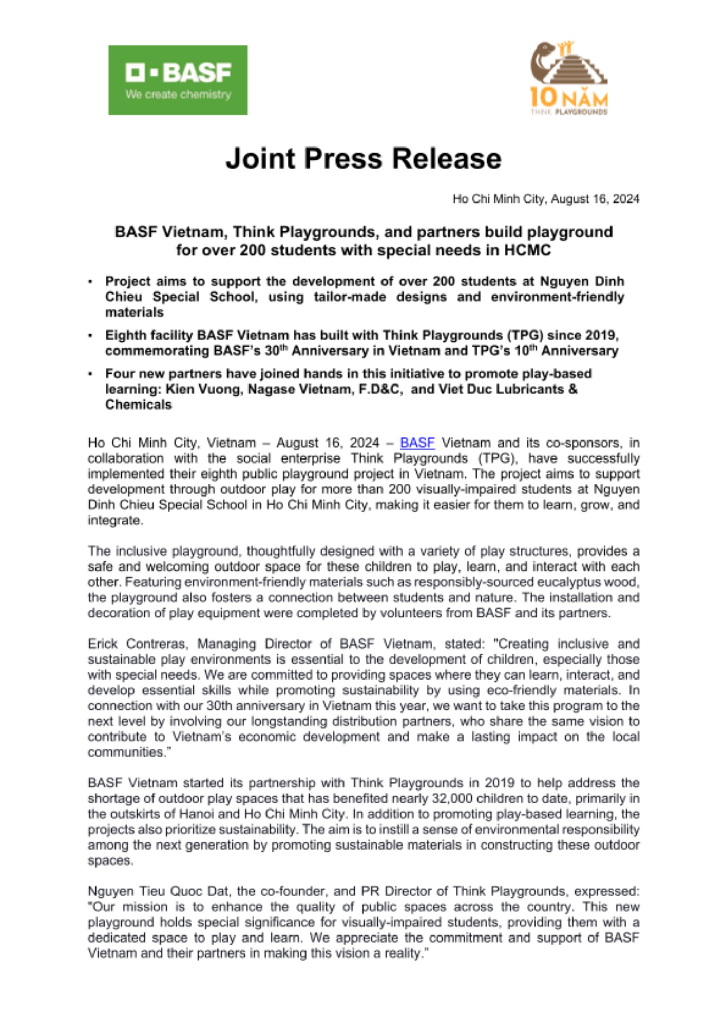 - Eighth facility BASF Vietnam has built with Think Playgrounds (TPG) since 2019, commemorating BASF’s 30th Anniversary in Vietnam and TPG’s 10th Anniversary