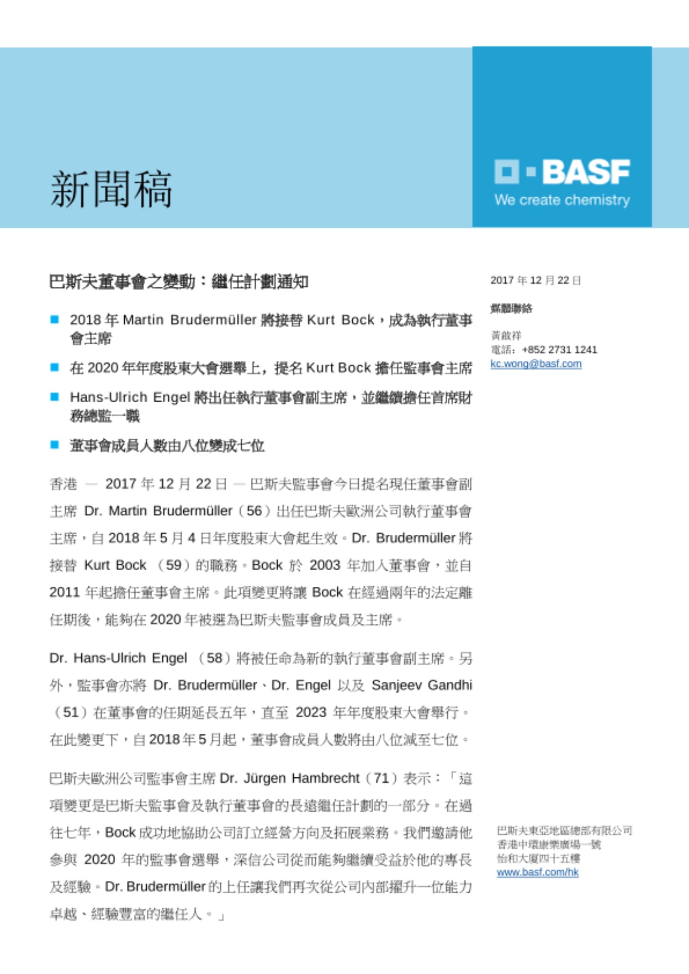 香港 — 2017 年 12 月 22日 — 巴斯夫監事會今日提名現任董事會副主席Dr. Martin Brudermüller(56)出任巴斯夫歐洲公司執行董事會主席,自2018年5月4日年度股東大會起生效。Dr. Brudermüller將接替Kurt Bock (59)的職務。Bock於2003年加入董事會,並自2011年起擔任董事會主席。此項變更將讓Bock在經過兩年的法定離任期後,能夠在2020年被選為巴斯夫監事會成員及主席。