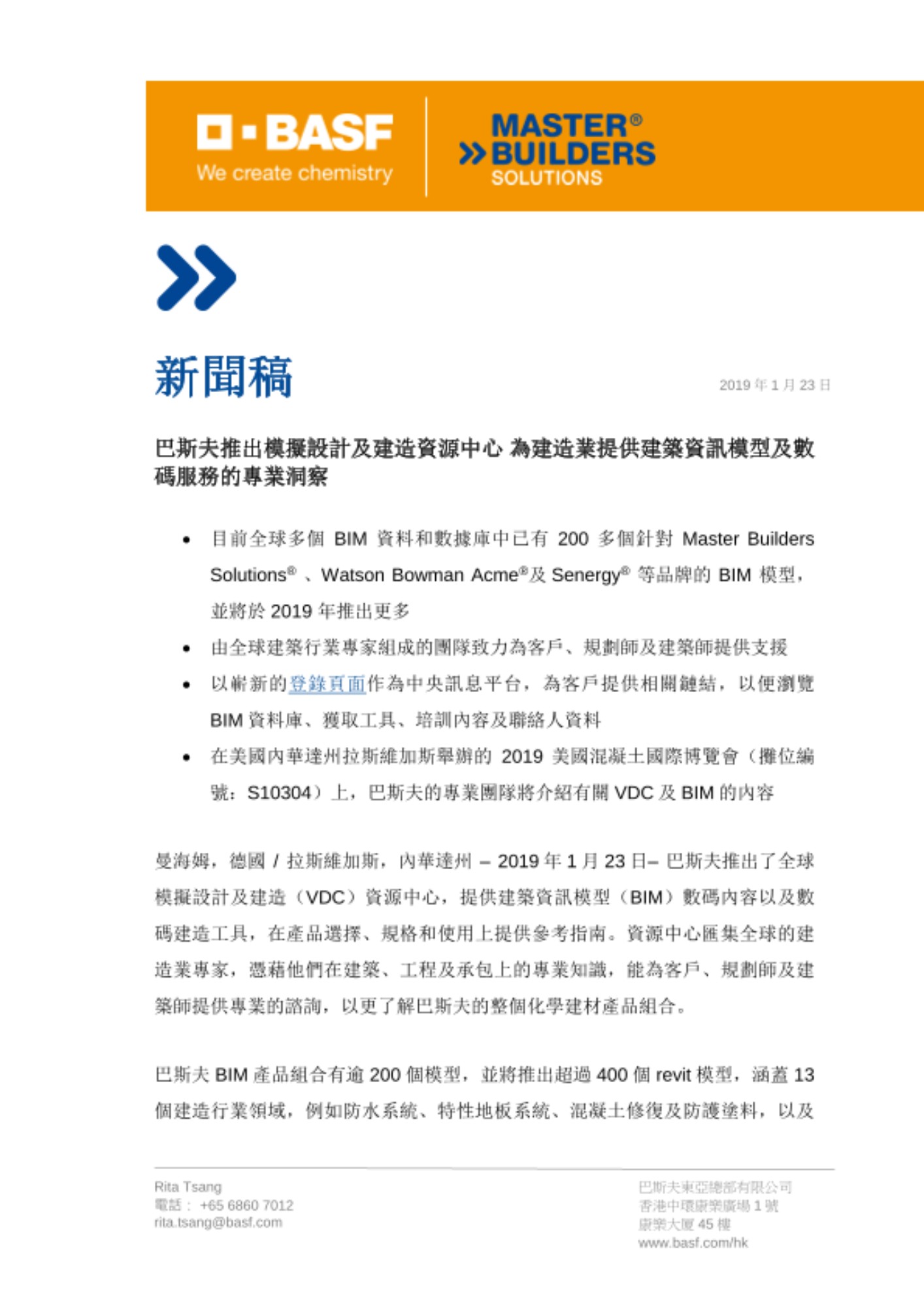 曼海姆,德國 / 拉斯維加斯,內華達州 – 2019年1月23日– 巴斯夫推出了全球模擬設計及建造(VDC)資源中心,提供建築資訊模型(BIM)數碼內容以及數碼建造工具,在產品選擇、規格和使用上提供參考指南。資源中心匯集全球的建造業專家,憑藉他們在建築、工程及承包上的專業知識,能為客戶、規劃師及建築師提供專業的諮詢,以更了解巴斯夫的整個化學建材產品組合。