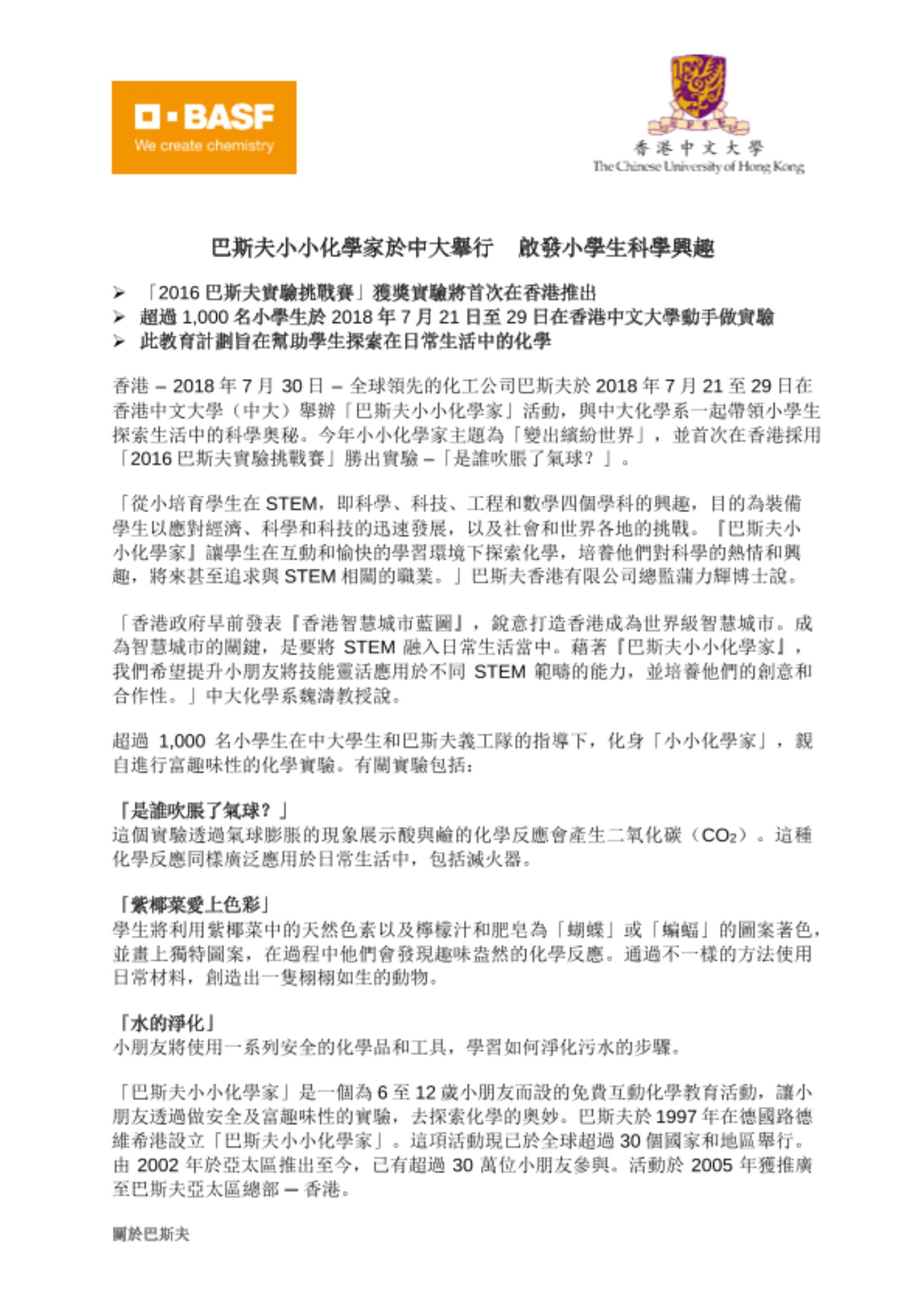 香港 – 2018年7月 30日 – 全球領先的化工公司巴斯夫於2018年7月21至29日在香港中文大學(中大)舉辦「巴斯夫小小化學家」活動,與中大化學系一起帶領小學生探索生活中的科學奥秘。今年小小化學家主題為「變出繽紛世界」,並首次在香港採用「2016巴斯夫實驗挑戰賽」勝出實驗 –「是誰吹脹了氣球?」。