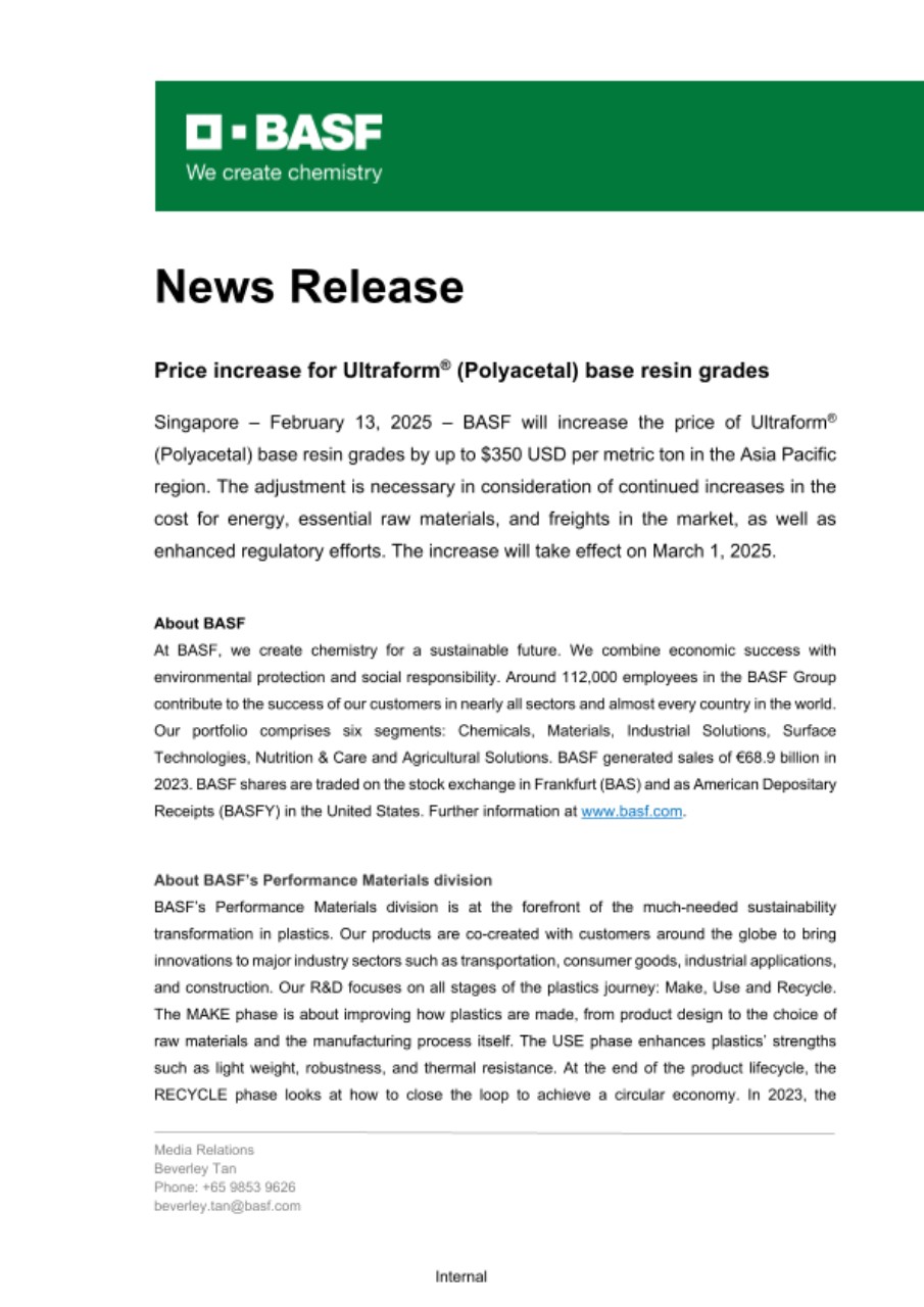 Singapore – February 13, 2025 – BASF will increase the price of Ultraform® (Polyacetal) base resin grades by up to $350 USD per metric ton in the Asia Pacific region. The adjustment is necessary in consideration of continued increases in the cost for energy, essential raw materials, and freights in the market, as well as enhanced regulatory efforts. The increase will take effect on March 1, 2025.