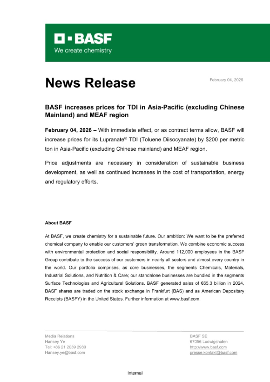February 04, 2026 – With immediate effect, or as contract terms allow, BASF will increase prices for its Lupranate® TDI (Toluene Diisocyanate) by $200 per metric ton in Asia-Pacific (excluding Chinese mainland) and MEAF region.