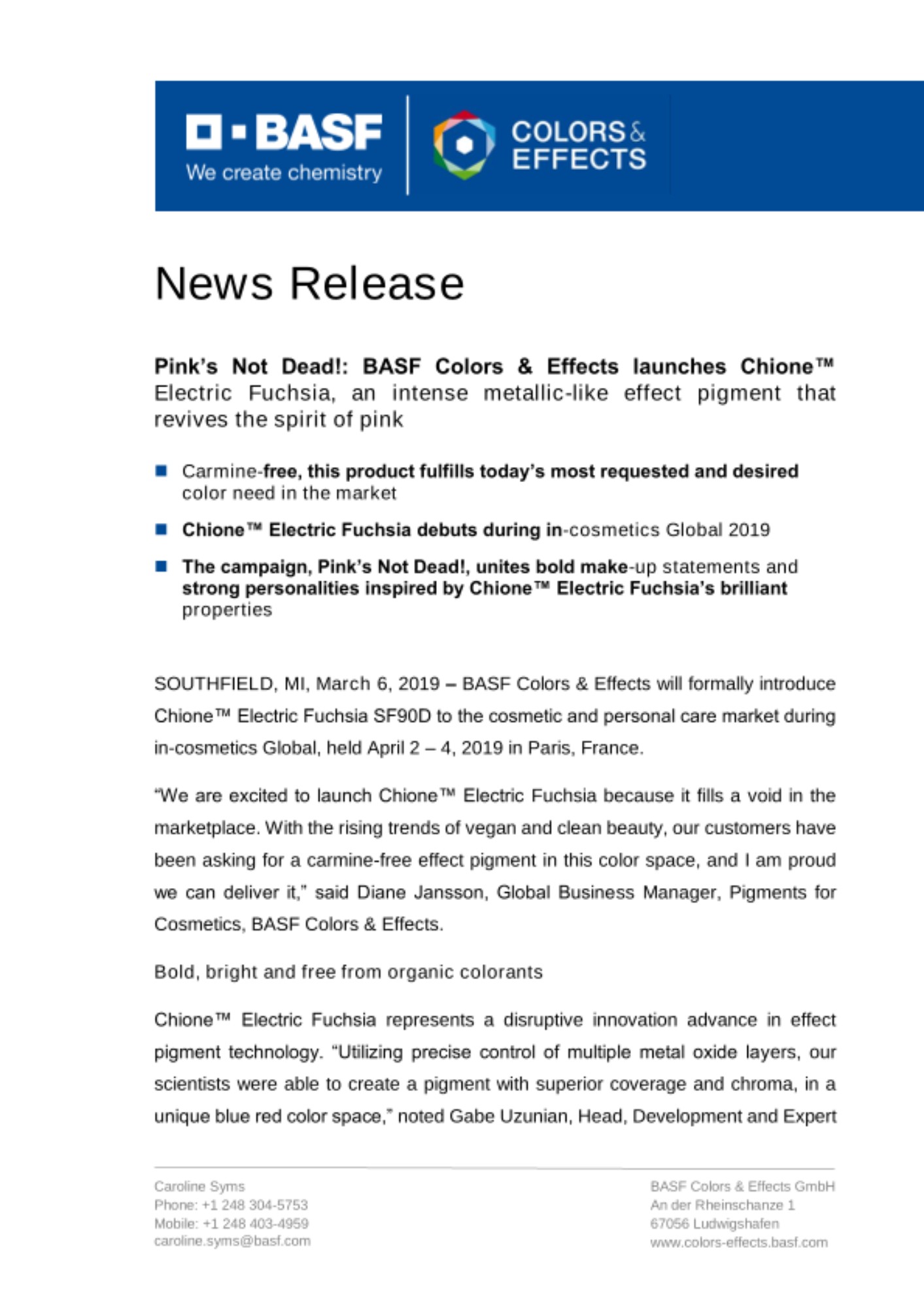 SOUTHFIELD, MI, March 6, 2019 – BASF Colors & Effects will formally introduce Chione™ Electric Fuchsia SF90D to the cosmetic and personal care market during in-cosmetics Global, held April 2 – 4, 2019 in Paris, France.