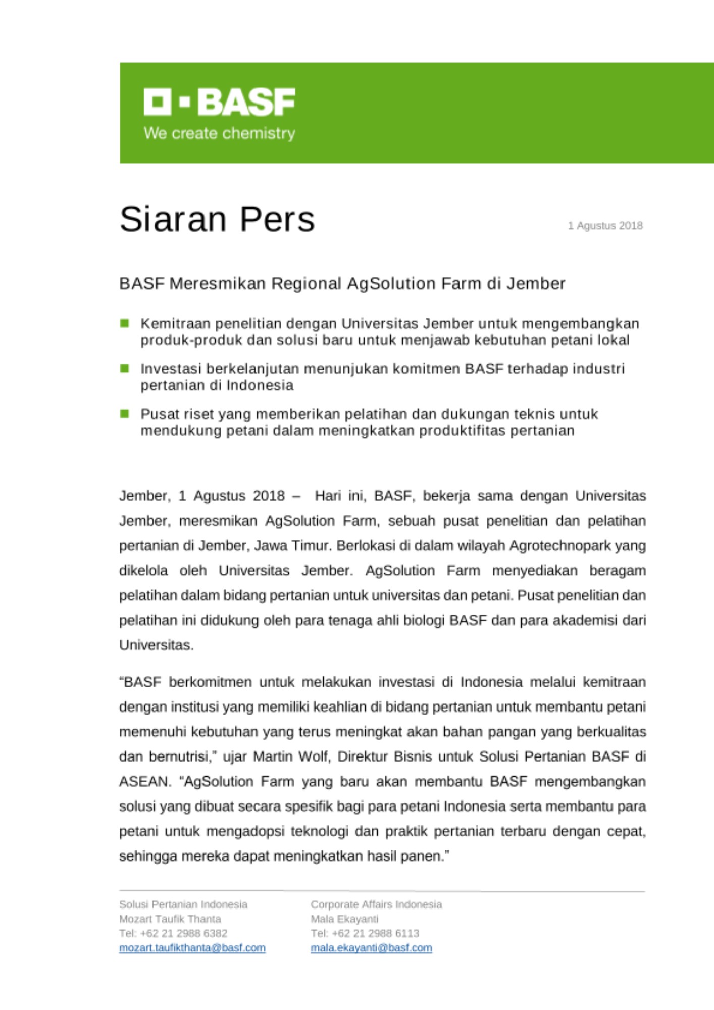 - Investasi berkelanjutan menunjukan komitmen BASF terhadap industri pertanian di Indonesia