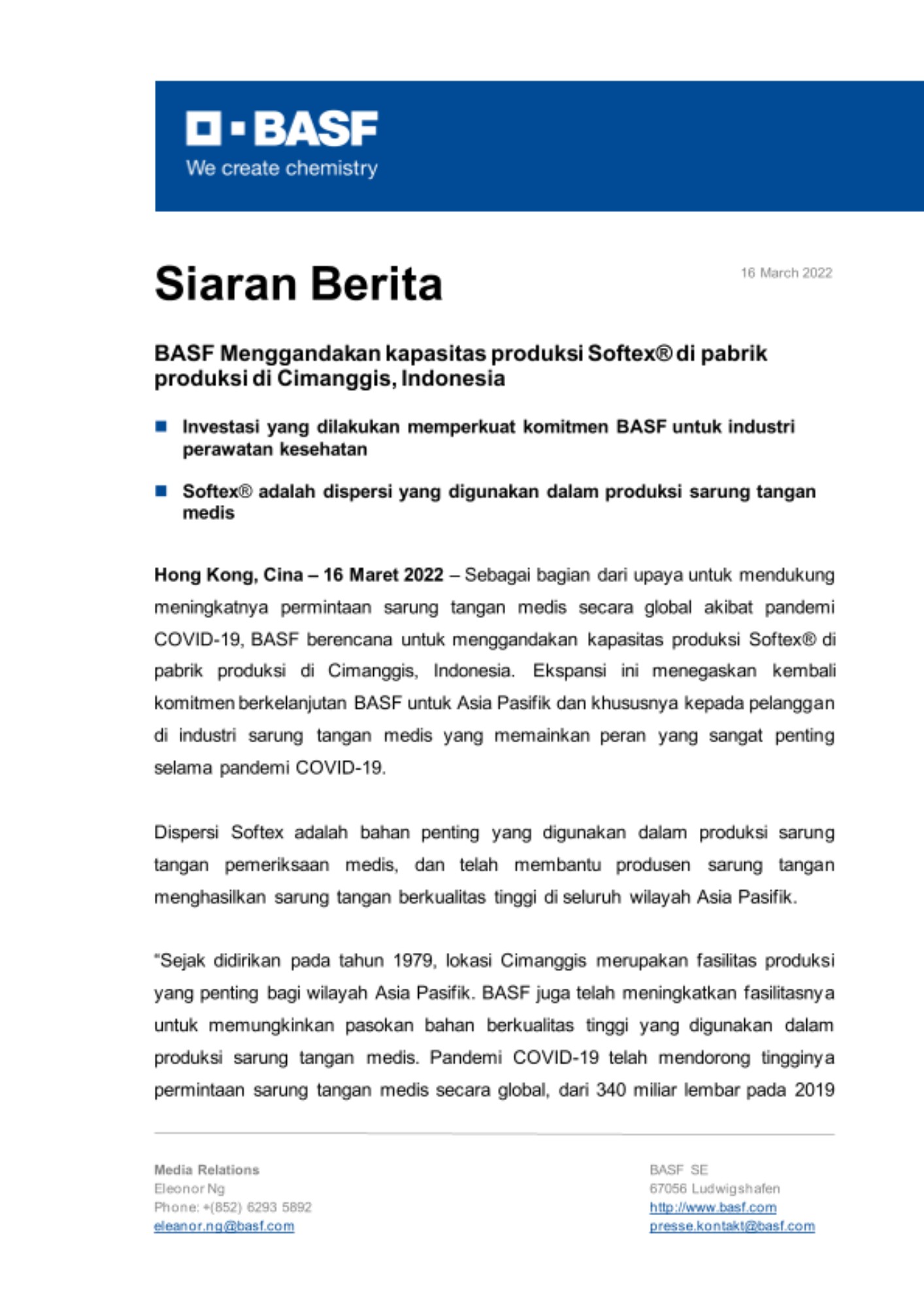 Hong Kong, Cina – 16 Maret 2022 – Sebagai bagian dari upaya untuk mendukung meningkatnya permintaan sarung tangan medis secara global akibat pandemi COVID-19, BASF berencana untuk menggandakan kapasitas produksi Softex® di pabrik produksi di Cimanggis, Indonesia. Ekspansi ini menegaskan kembali komitmen berkelanjutan BASF untuk Asia Pasifik dan khususnya kepada pelanggan di industri sarung tangan medis yang memainkan peran yang sangat penting selama pandemi COVID-19.