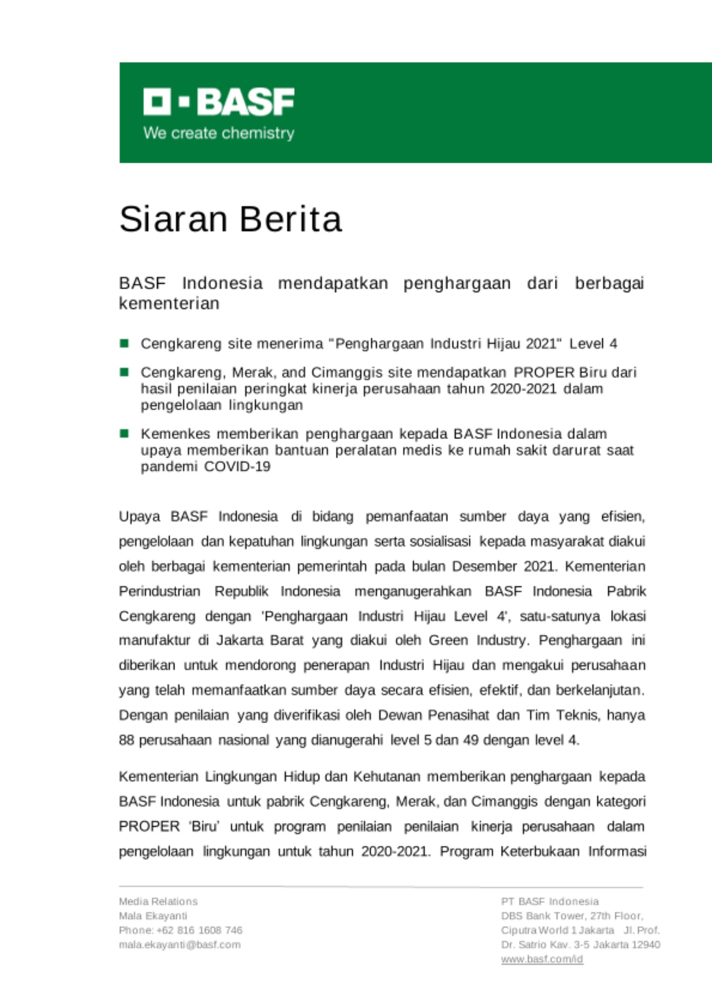 Kementerian Lingkungan Hidup dan Kehutanan memberikan penghargaan kepada BASF Indonesia untuk pabrik Cengkareng, Merak, dan Cimanggis dengan kategori PROPER ‘Biru’ untuk program penilaian penilaian kinerja perusahaan dalam pengelolaan lingkungan untuk tahun 2020-2021. Program Keterbukaan Informasi Lingkungan (PROPER) setiap tahun diselenggarakan oleh Kementerian Lingkungan Hidup dan Kehutanan untuk mendorong kepatuhan industri terhadap peraturan lingkungan. PROPER Biru mencerminkan kepatuhan penuh perusahaan terhadap pengelolaan lingkungan.