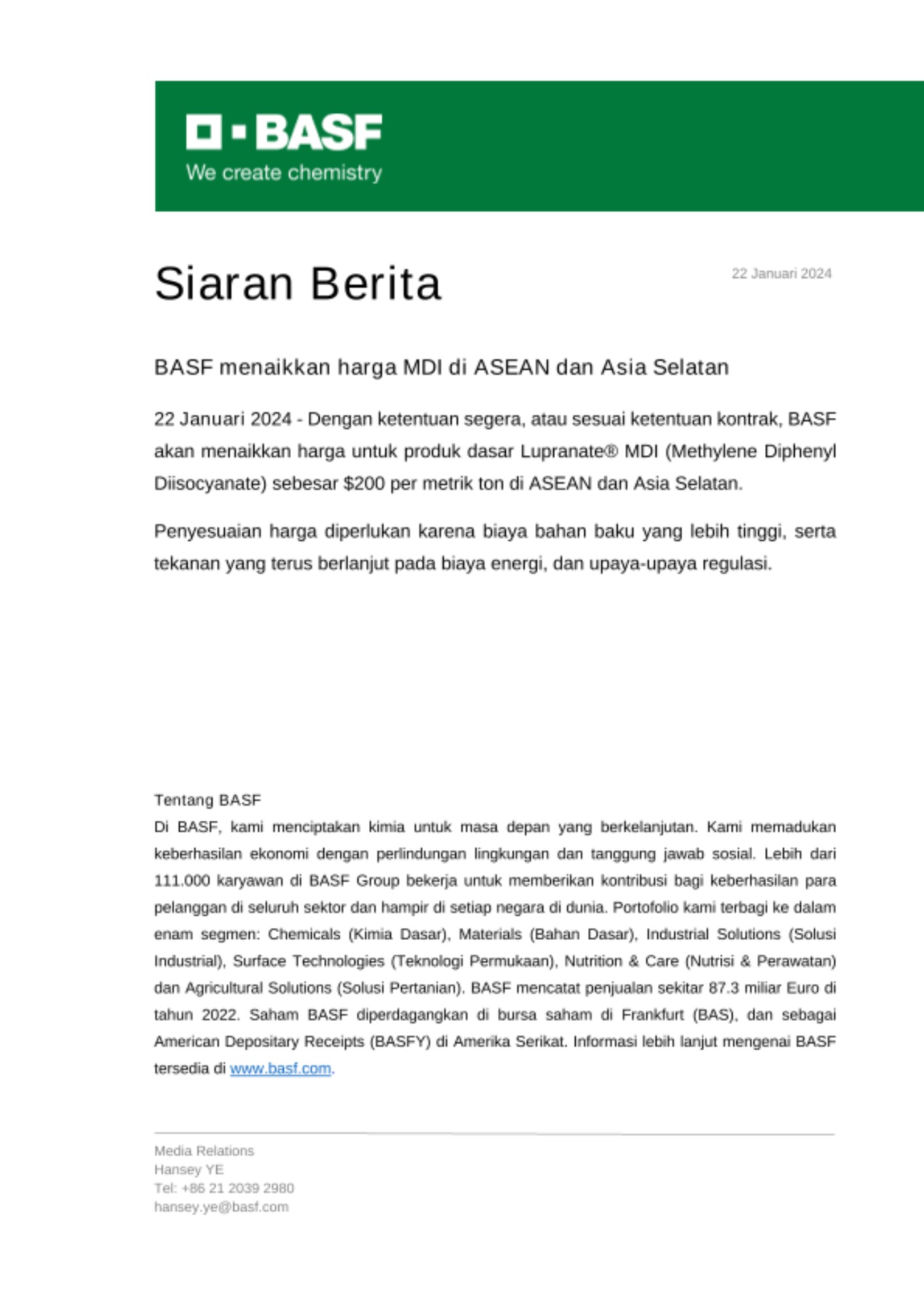 22 Januari 2024 - Dengan ketentuan segera, atau sesuai ketentuan kontrak, BASF akan menaikkan harga untuk produk dasar Lupranate® MDI (Methylene Diphenyl Diisocyanate) sebesar $200 per metrik ton di ASEAN dan Asia Selatan.