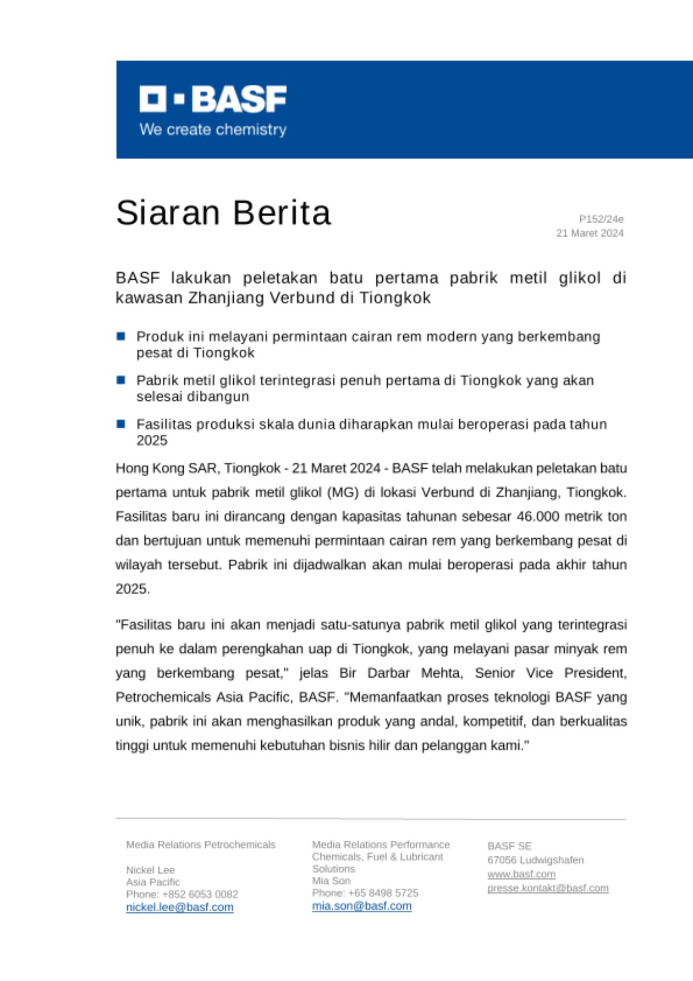 Hong Kong SAR, Tiongkok - 21 Maret 2024 - BASF telah melakukan peletakan batu pertama untuk pabrik metil glikol (MG) di lokasi Verbund di Zhanjiang, Tiongkok. Fasilitas baru ini dirancang dengan kapasitas tahunan sebesar 46.000 metrik ton dan bertujuan untuk memenuhi permintaan cairan rem yang berkembang pesat di wilayah tersebut. Pabrik ini dijadwalkan akan mulai beroperasi pada akhir tahun 2025.