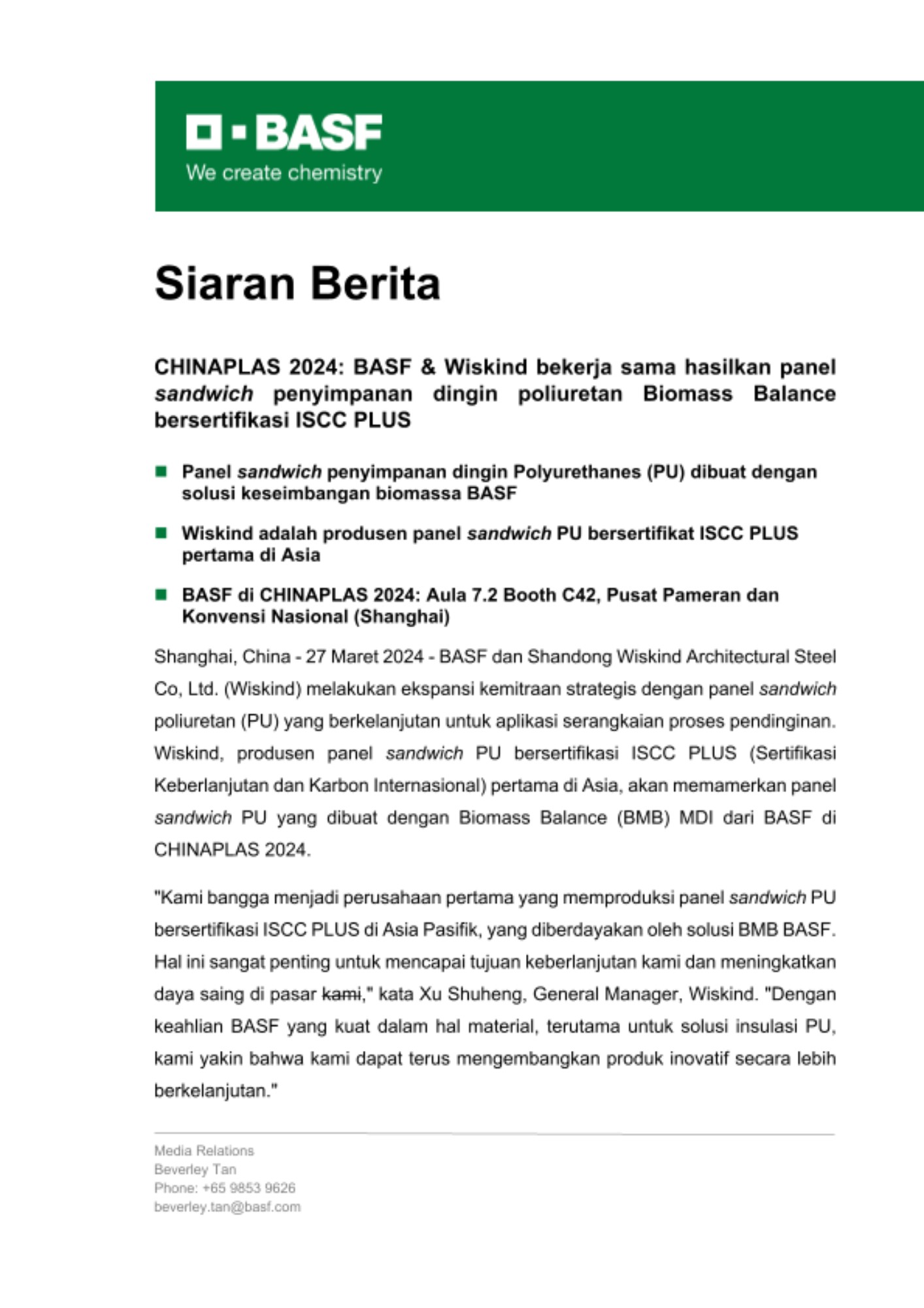 CHINAPLAS 2024: BASF & Wiskind bekerja sama hasilkan panel sandwich penyimpanan dingin poliuretan Biomass Balance bersertifikasi ISCC PLUS