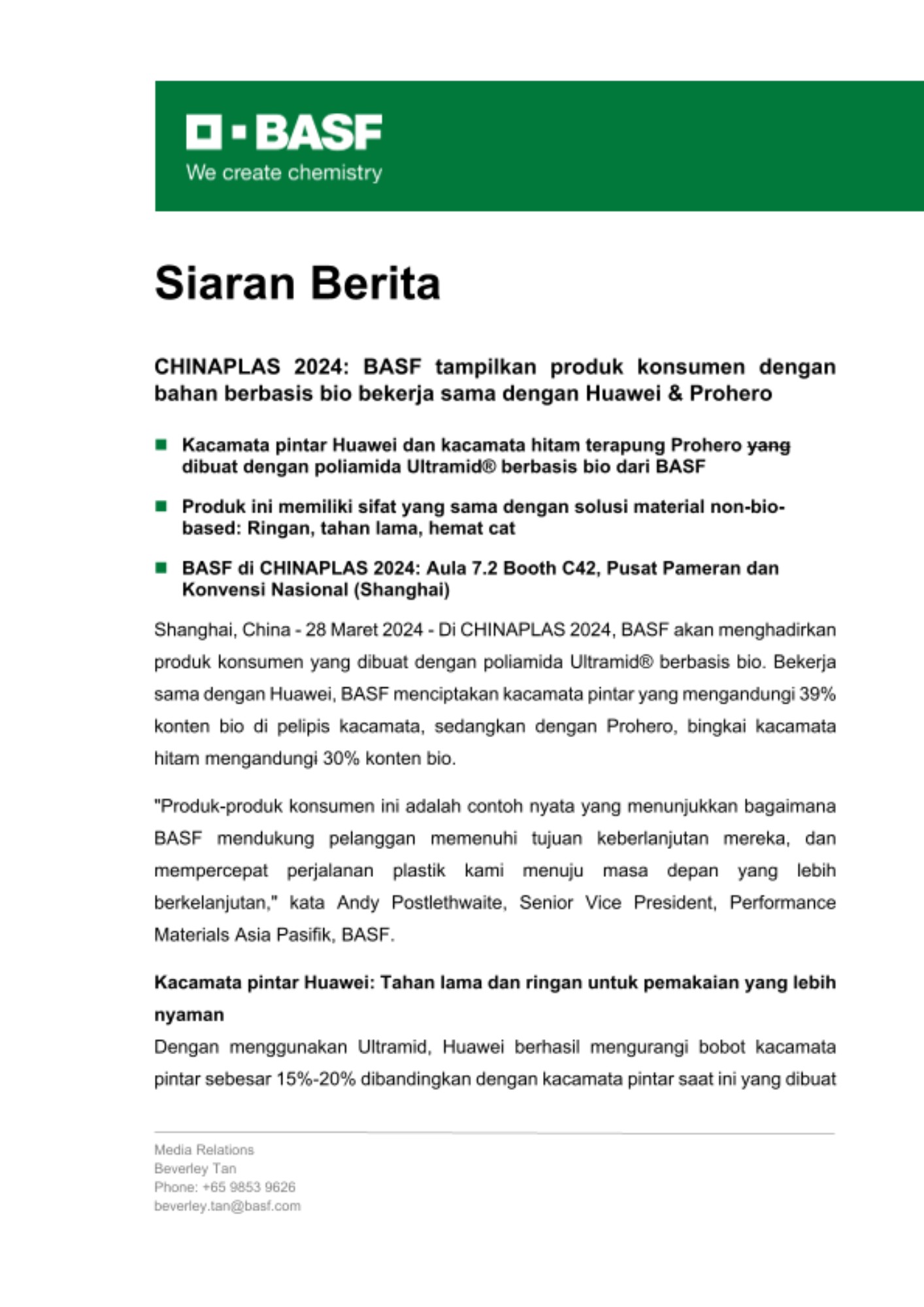 CHINAPLAS 2024: BASF tampilkan produk konsumen dengan bahan berbasis bio bekerja sama dengan Huawei dan Prohero
