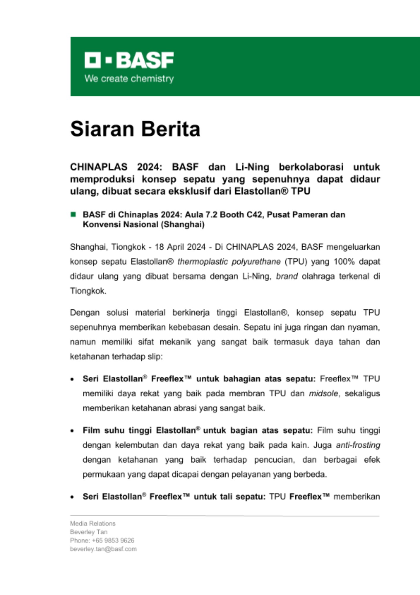 "Kemitraan antara Li-Ning dan BASF menunjukkan bagaimana kami dapat menciptakan situasi yang saling menguntungkan untuk mencapai tujuan bisnis dan keberlanjutan segmen alas kaki," kata Marilyn Lye, Vice President, Performance Materials Asia Pasifik, BASF. "Teknologi canggih dan bahan daur ulang yang kami bawa ke konsep sepatu adalah contoh yang baik untuk ditunjukkan kepada seluruh rantai nilai produksi alas kaki yang maju dalam perjalanan keberlanjutannya."