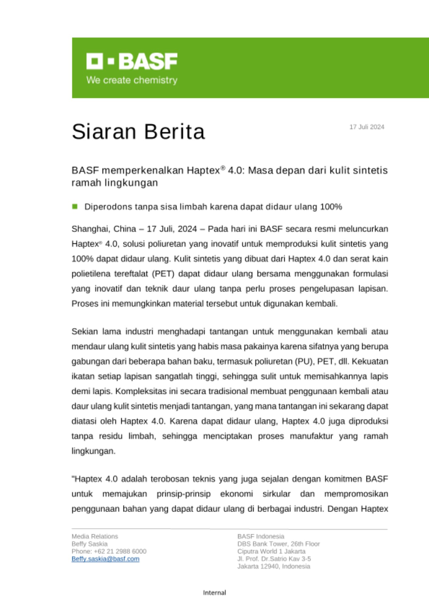 Shanghai, China – 17 Juli, 2024 – Pada hari ini BASF secara resmi meluncurkan Haptex® 4.0, solusi poliuretan yang inovatif untuk memproduksi kulit sintetis yang 100% dapat didaur ulang. Kulit sintetis yang dibuat dari Haptex 4.0 dan kain polietilena tereftalat (PET) dapat didaur ulang bersama menggunakan formulasi inovatif dan jalur teknis daur ulang tanpa perlu proses pengelupasan lapisan. Proses ini memungkinkan material tersebut untuk kembali digunakan.