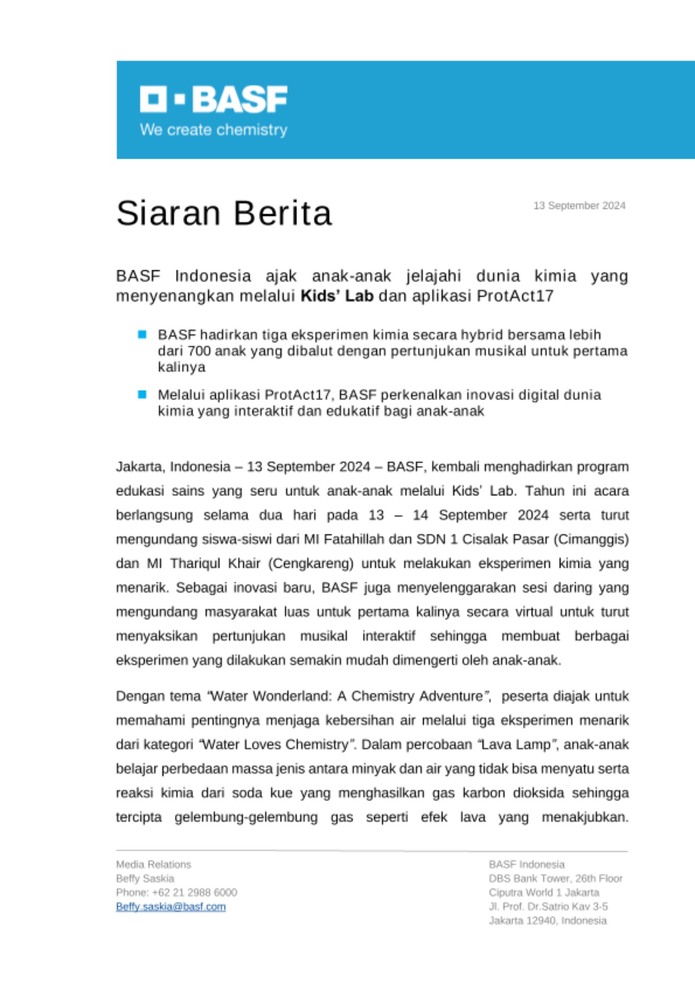 Jakarta, Indonesia – 13 September 2024 – BASF, kembali menghadirkan program edukasi sains yang seru untuk anak-anak melalui Kids’ Lab. Tahun ini acara berlangsung selama dua hari pada 13 – 14 September 2024 serta turut mengundang siswa-siswi dari MI Fatahillah dan SDN 1 Cisalak Pasar (Cimanggis) dan MI Thariqul Khair (Cengkareng) untuk melakukan eksperimen kimia yang menarik. Sebagai inovasi baru, BASF juga menyelenggarakan sesi daring yang mengundang masyarakat luas untuk pertama kalinya secara virtual untuk turut menyaksikan pertunjukan musikal interaktif sehingga membuat berbagai eksperimen yang dilakukan semakin mudah dimengerti oleh anak-anak.