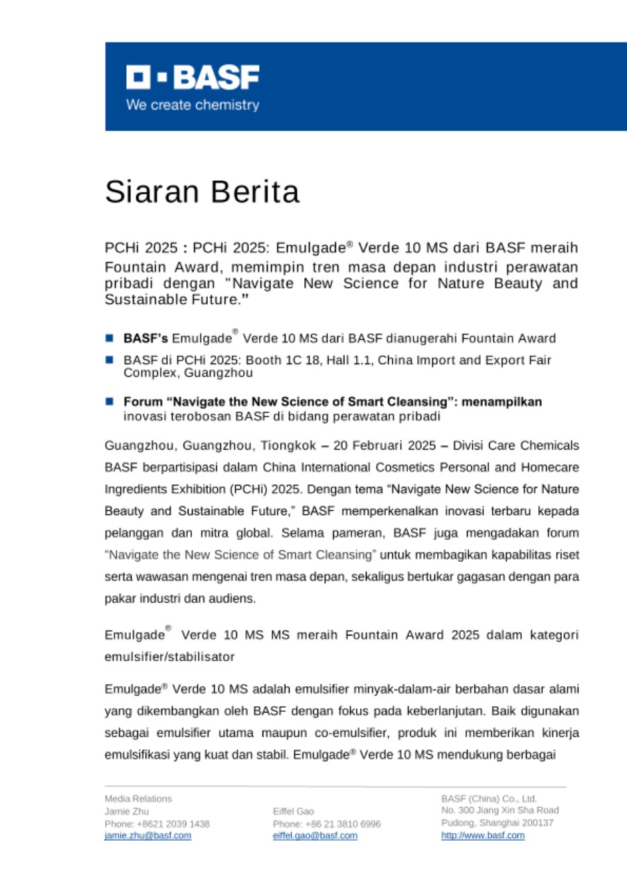 PCHi 2025:PCHi 2025: Emulgade® Verde 10 MS dari BASF meraih Fountain Award, memimpin tren masa depan industri perawatan pribadi dengan "Navigate New Science for Nature Beauty and Sustainable Future.”