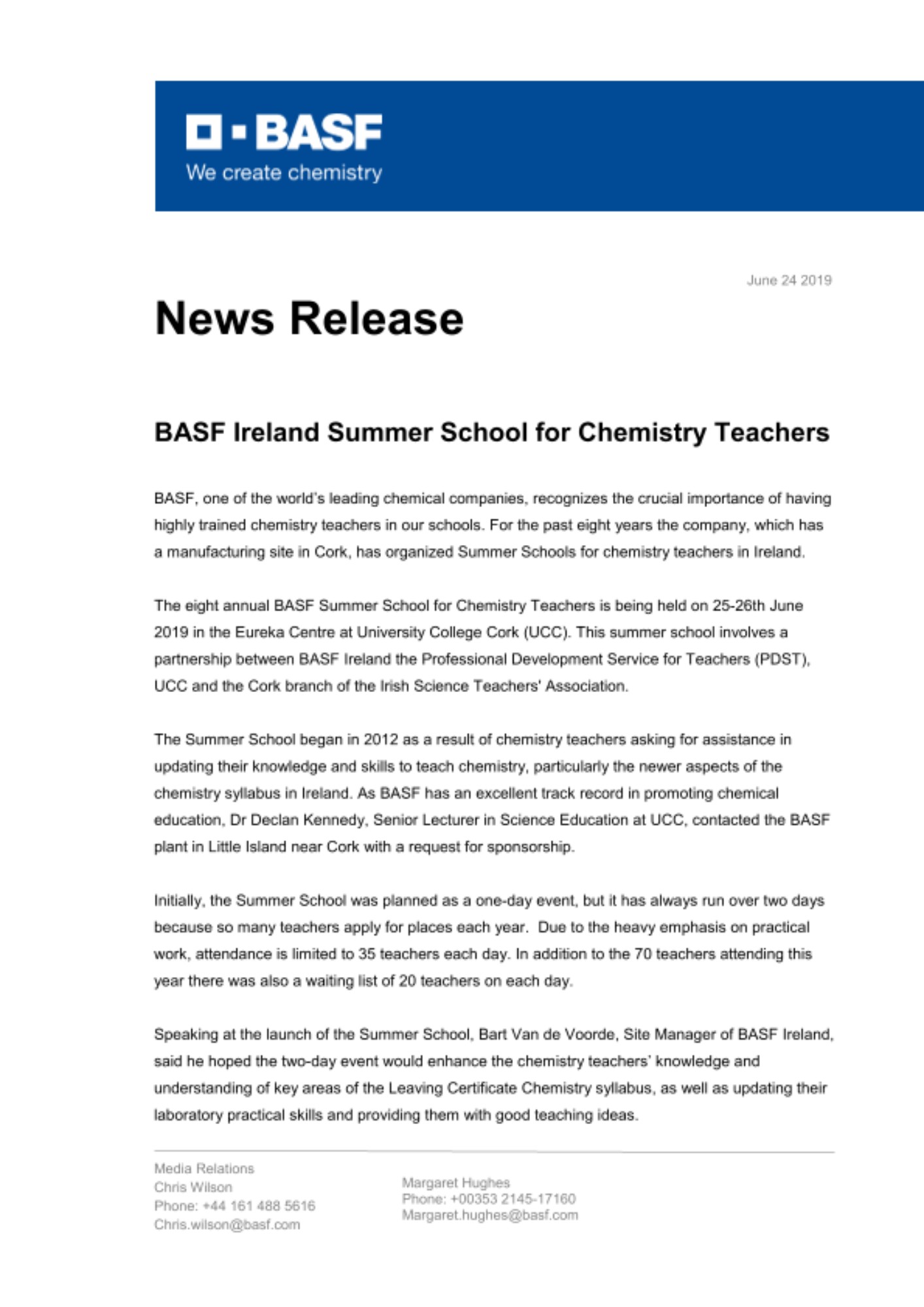 BASF, one of the world’s leading chemical companies, recognizes the crucial importance of having highly trained chemistry teachers in our schools. For the past eight years the company, which has a manufacturing site in Cork, has organized Summer Schools for chemistry teachers in Ireland.