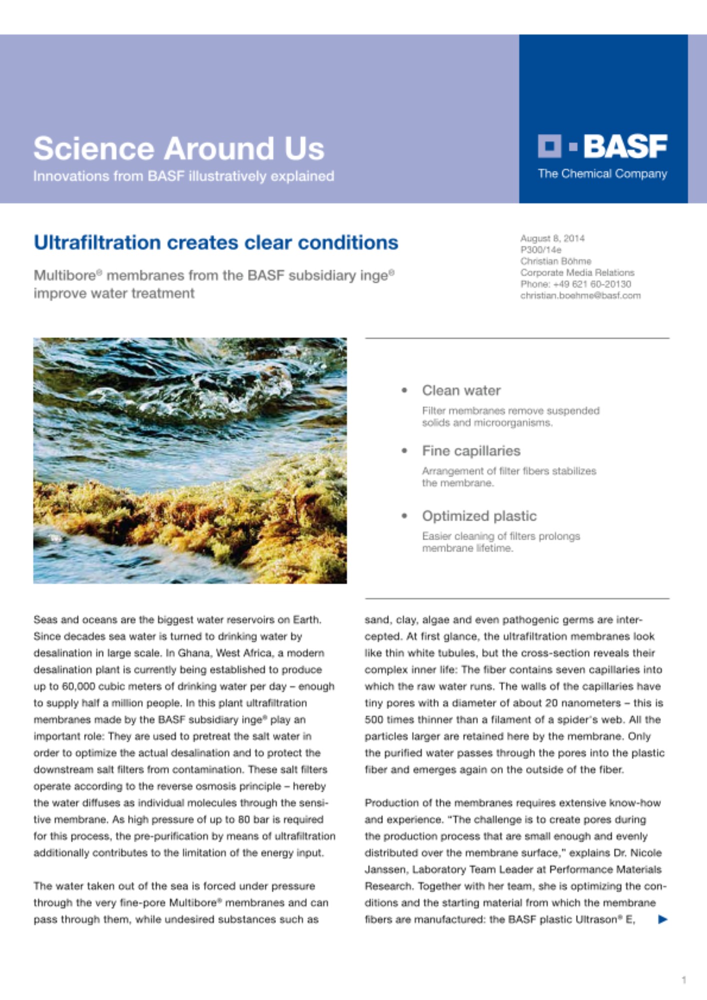 Seas and oceans are the biggest water reservoirs on Earth. Since decades sea water is turned to drinking water by desalination in large scale. In Ghana, West Africa, a modern desalination plant is currently being established to produce up to 60,000 cubic meters of drinking water per day - enough to supply half a million people. In this plant ultrafiltration membranes made by the BASF subsidiary inge® play an important role: They are used to pretreat the salt water in order to optimize the actual desalination and to protect the downstream salt filters from contamination. These salt filters operate according to the reverse osmosis principle - hereby the water diffuses as individual molecules through the sensitive membrane. As high pressure of up to 80 bar is required for this process, the pre-purification by means of ultrafiltration additionally contributes to the limitation of the energy input.