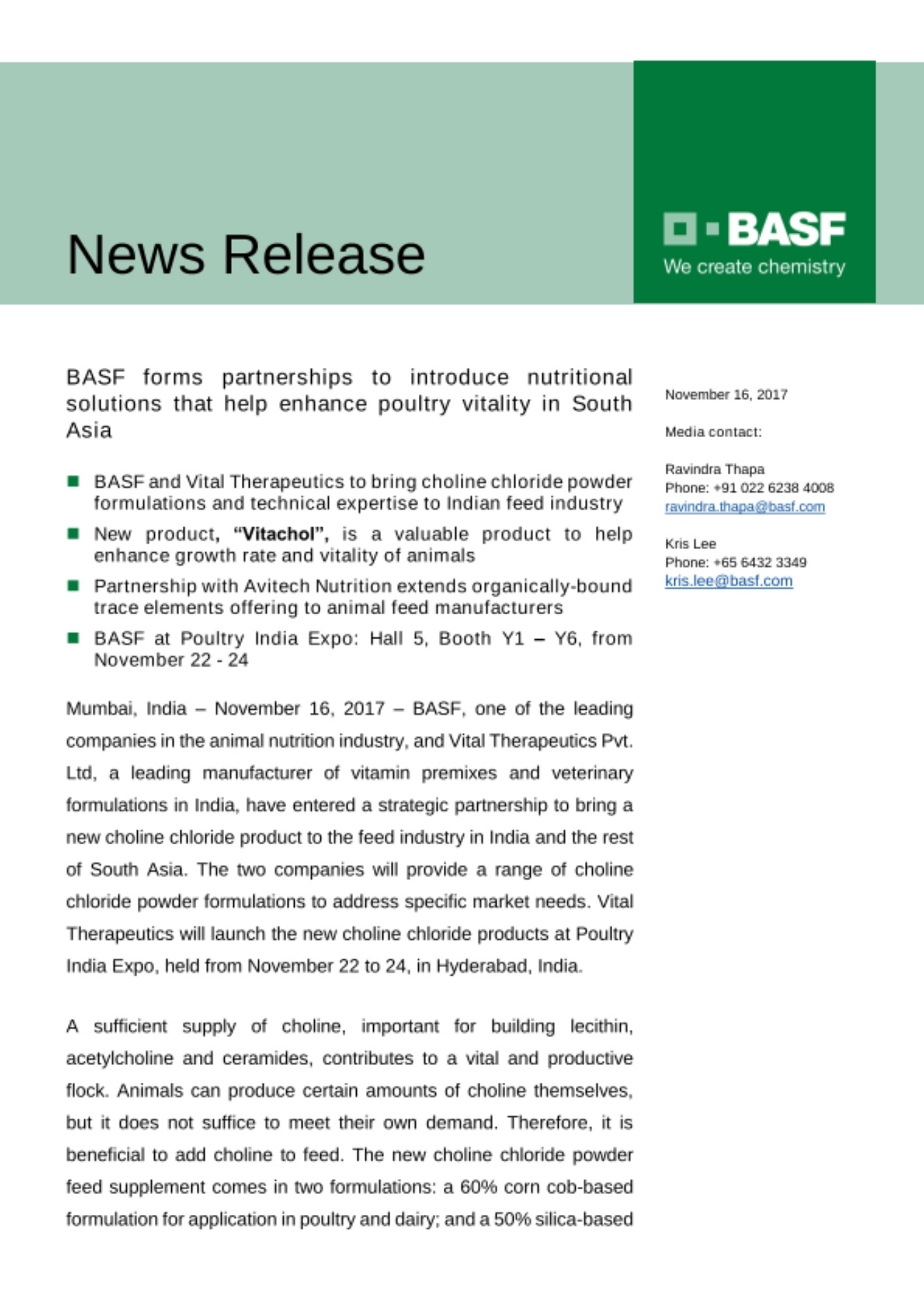 Mumbai, India – November 16, 2017 – BASF, one of the leading companies in the animal nutrition industry, and Vital Therapeutics Pvt. Ltd, a leading manufacturer of vitamin premixes and veterinary formulations in India, have entered a strategic partnership to bring a new choline chloride product to the feed industry in India and the rest of South Asia. The two companies will provide a range of choline chloride powder formulations to address specific market needs. Vital Therapeutics will launch the new choline chloride products at Poultry India Expo, held from November 22 to 24, in Hyderabad, India.