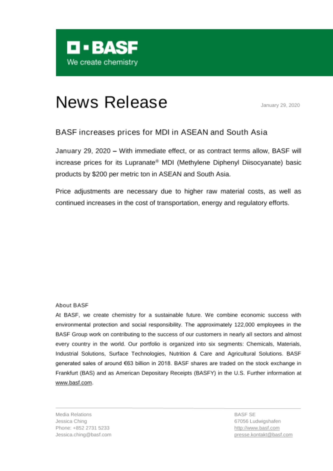 January 29, 2020 – With immediate effect, or as contract terms allow, BASF will increase prices for its Lupranate® MDI (Methylene Diphenyl Diisocyanate) basic products by $200 per metric ton in ASEAN and South Asia.