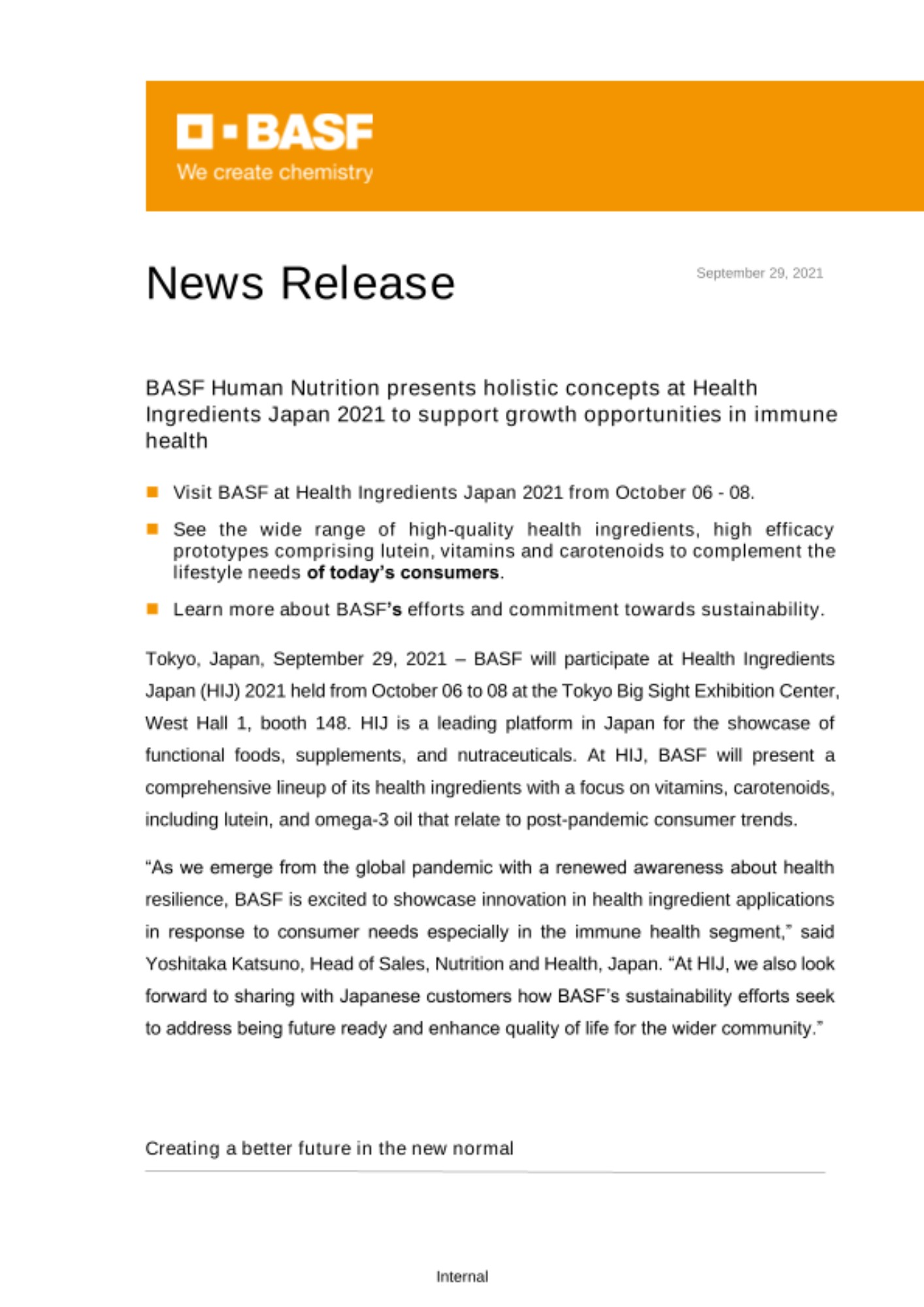Tokyo, Japan, September 29, 2021 – BASF will participate at Health Ingredients Japan (HIJ) 2021 held from October 06 to 08 at the Tokyo Big Sight Exhibition Center, West Hall 1, booth 148. HIJ is a leading platform in Japan for the showcase of functional foods, supplements, and nutraceuticals. At HIJ, BASF will present a comprehensive lineup of its health ingredients with a focus on vitamins, carotenoids, including lutein, and omega-3 oil that relate to post-pandemic consumer trends.