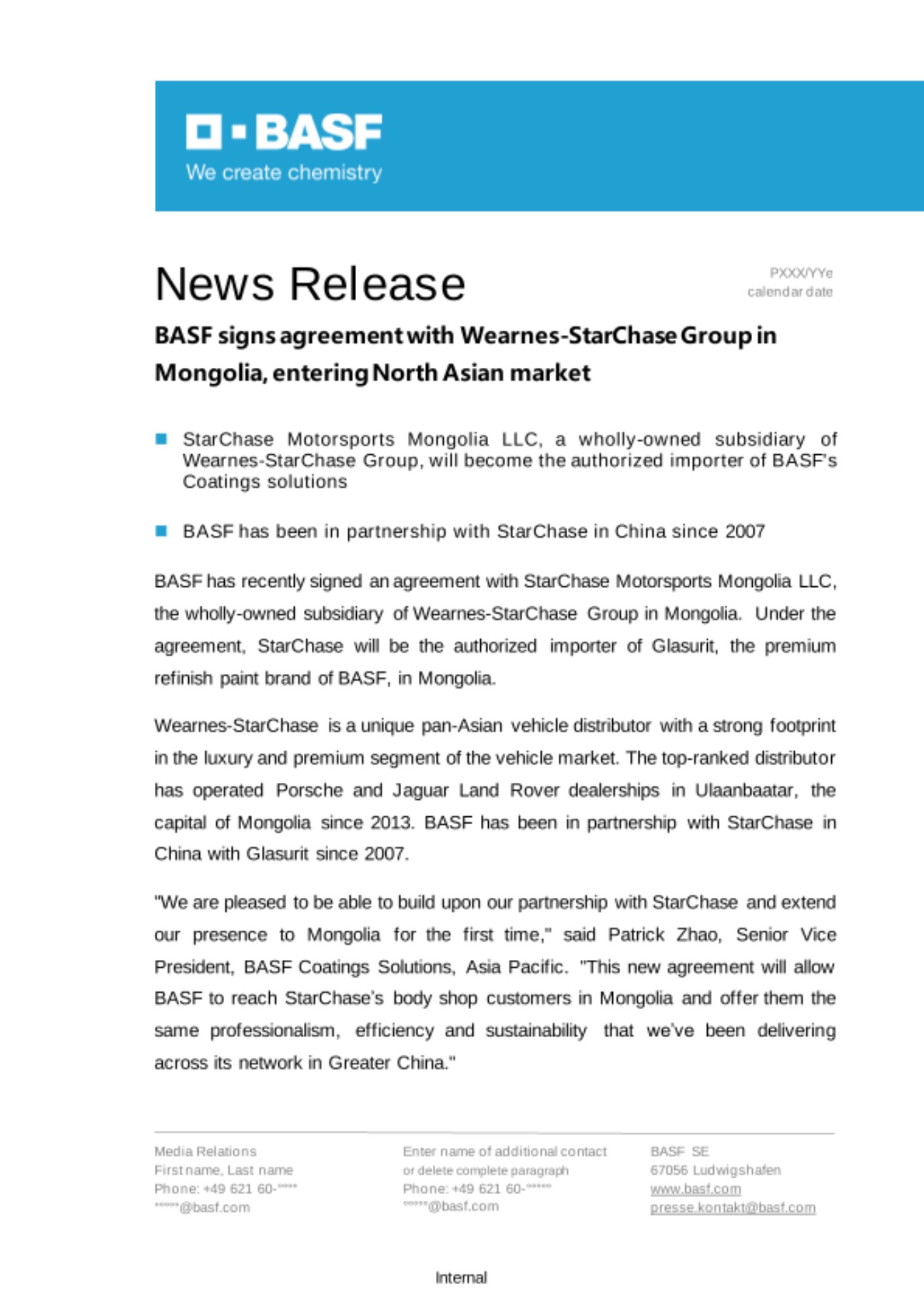 "BASF is already an important business partner for the Wearnes-StarChase Group across all our operations in Greater China. We have jointly and successfully piloted the Glasurit 100 Line in our Porsche centers in China, and we are enjoying the benefits of a strong marketing cooperation in motorsport. We are proud that BASF now entrusts us with the importer responsibility for the Mongolian market as well, strengthening our partnership even further," said Robby Niermann, Chief Executive Officer Greater China, StarChase Motorsports Trading (Shanghai) Limited.