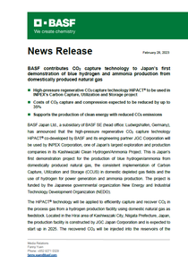 Mami Kawakatsu, Head of Sales, Intermediates Division of BASF Japan, said, “Following the successful use of BASF’s OASE® gas treating technology in another NEDO-funded CCS project in Tomakomai, Japan, we are pleased to provide HiPACT® for Japan's first demonstration project to produce blue hydrogen and ammonia from domestic natural gas. The role of our excellent gas-treating technologies is recognized in these milestone projects in Japan’s net zero roadmap. We will continue to contribute to Japan’s 2050 carbon neutrality goal.”