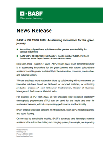 New Delhi, India – March 17, 2023 – At PU TECH 2023, BASF demonstrates how it is accelerating innovations for the green journey with various polyurethane solutions to enable greater sustainability in the automotive, consumer, construction, and industrial sectors.